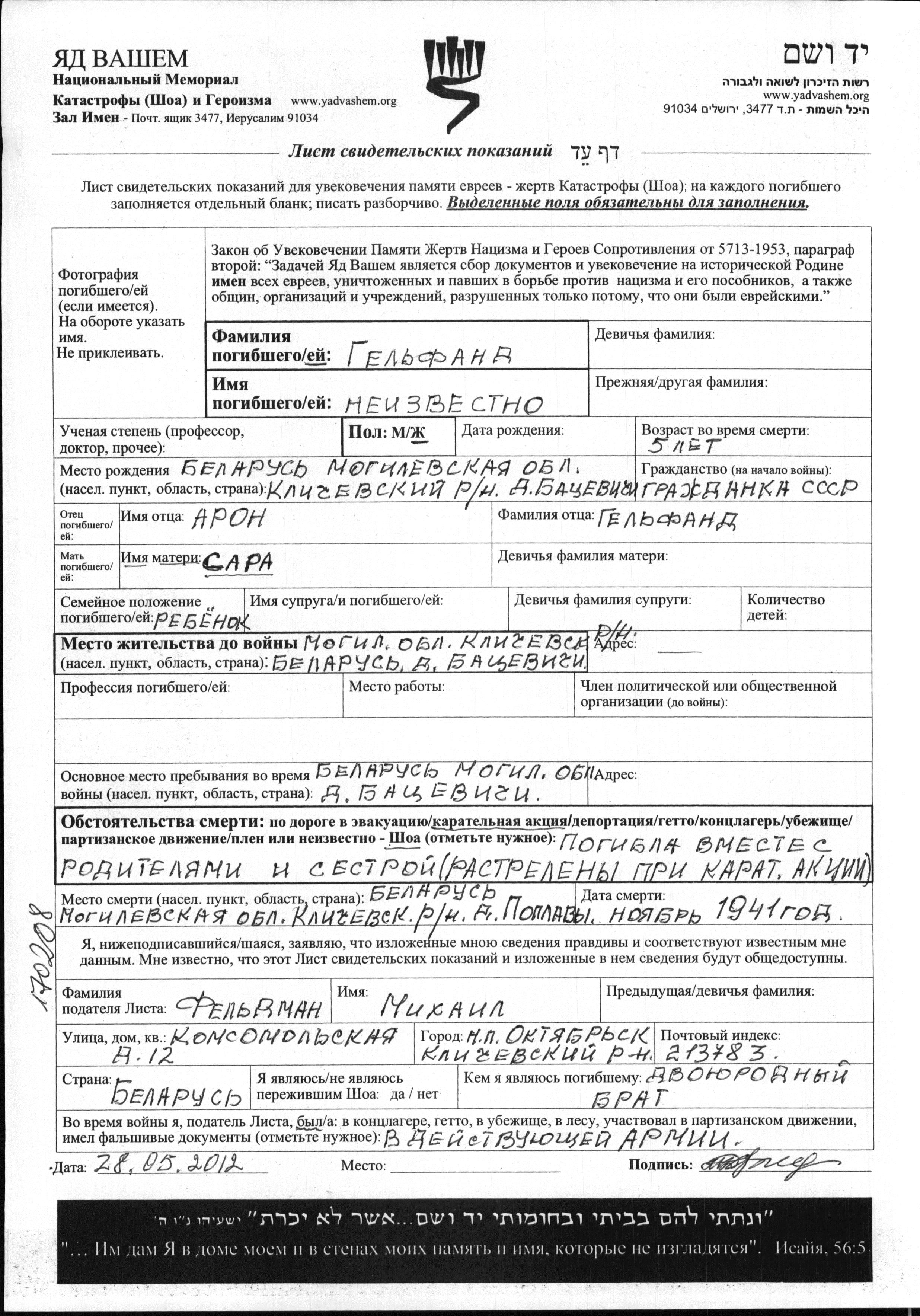 First name unknown Gelfand was born in Batsevichi, Belorussia (USSR) to Aron and Sara. She was child. Prior to WWII she lived in Batsevichi, Belorussia (USSR). During the war she was in Batsevichi, Belorussia (USSR). She was murdered in the Shoah. Place of death: Poplavy, Belorussia (USSR), 11/1941.