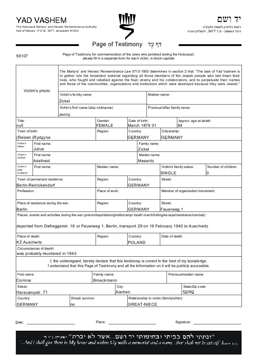 Jenny Zickel was born in Rydzyna, Poland, 1879 to Julius and Adelheid nee Meseritz. She was single. Prior to WWII she lived in Berlin Reinickendorf, Germany. During the war she was in Berlin, Germany. Jenny was murdered in the Shoah. Place of death: Auschwitz, Poland, 1943.