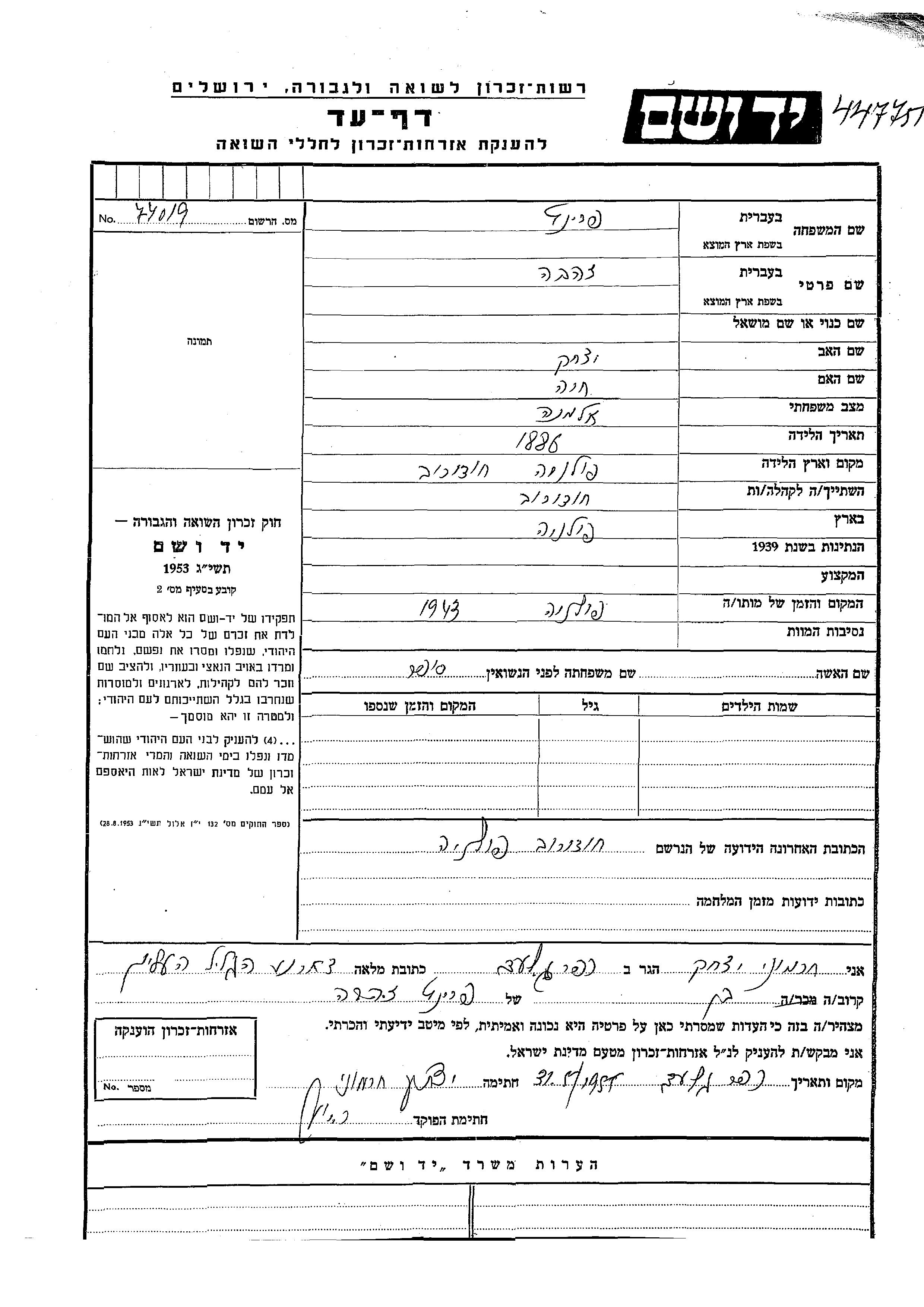 Zahava Printz nee Sofer was born in Chodorov, Poland, 1886 to Yitzkhak and Khaia. She was a widow. Prior to WWII she lived in Chodorov, Poland. During the war she was in Chodorov, Poland. Zahava was murdered in the Shoah. Place of death: Poland, 1943.