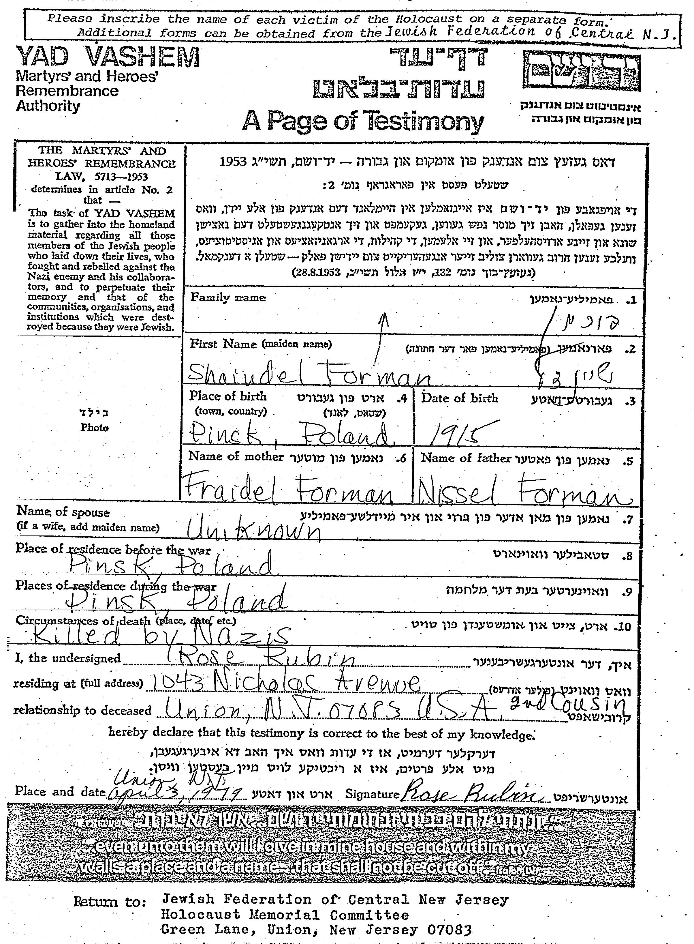 Shaindel Forman Furman was born in Pinsk, Poland, 1915 to Nissel and Fraidel. Prior to WWII she lived in Pinsk, Poland. During the war she was in Pinsk, Poland. Shaindel was murdered in the Shoah.