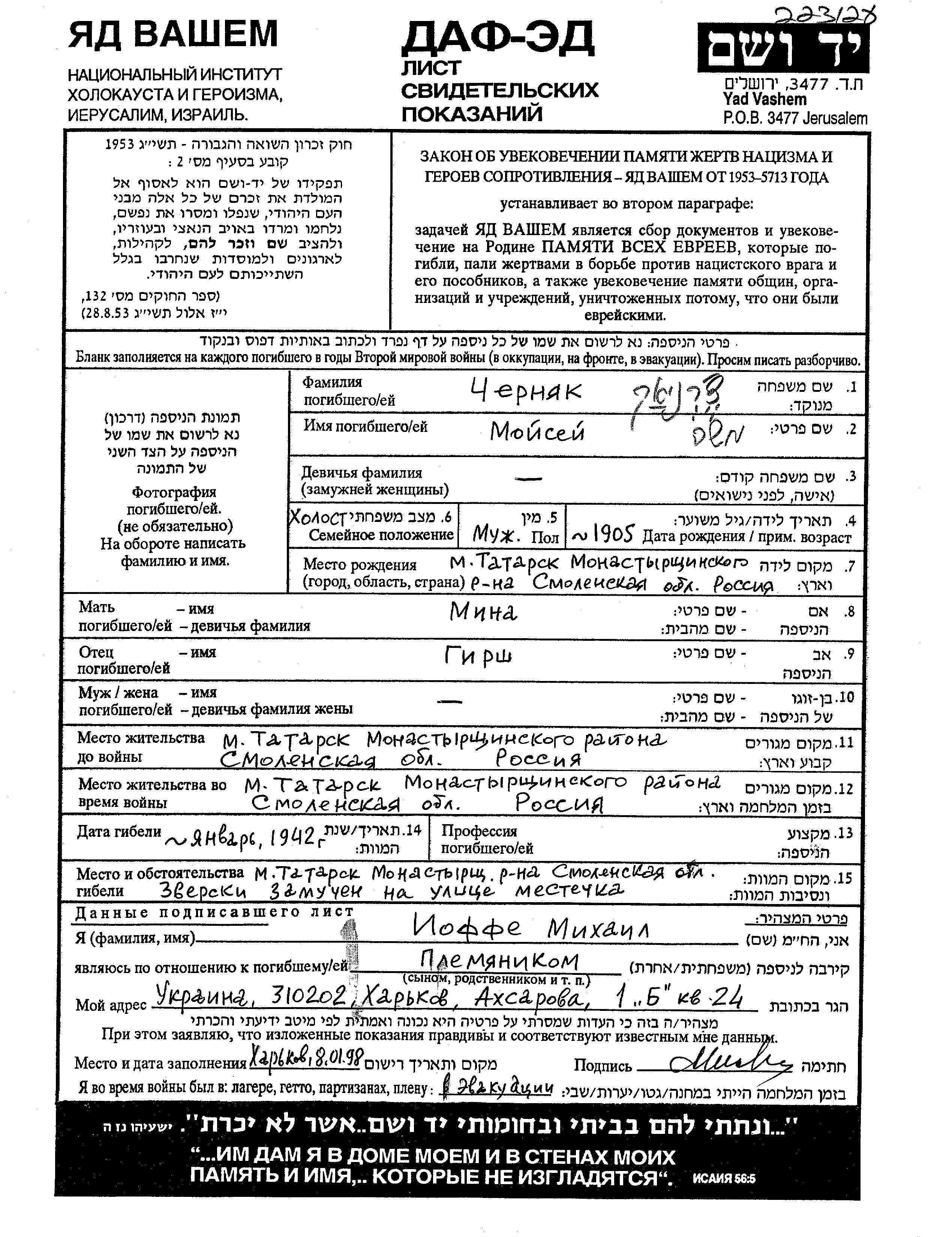 Cherniak Moisei 1905 Tatarsk, Russia (USSR) Page of Testimony