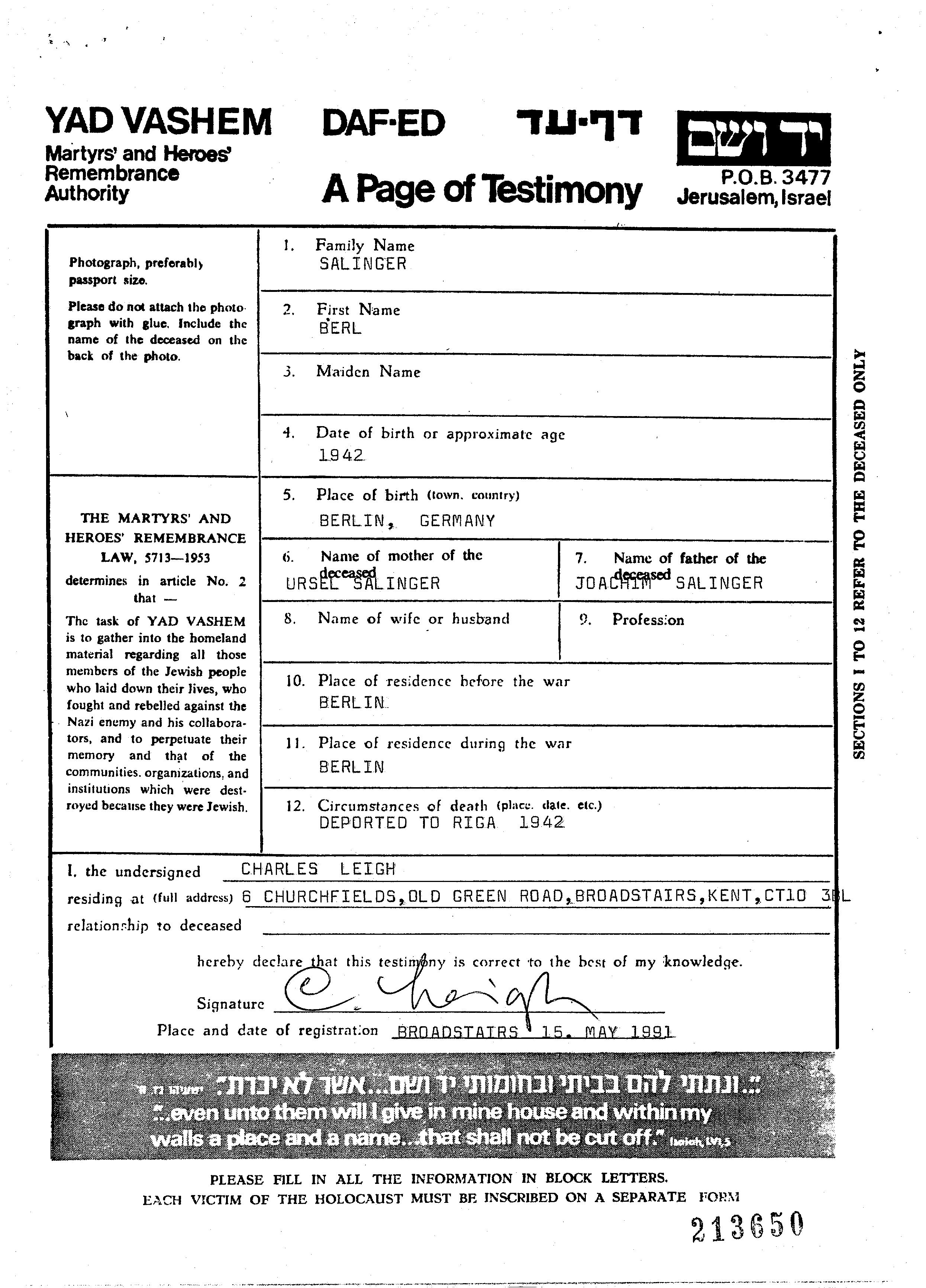Berl Salinger was born in Berlin, Germany, 1942 to Joachim and Ursel. Prior to WWII he lived in Berlin, Germany. During the war he was in Berlin, Germany. Berl was murdered in the Shoah. Place of death: Riga, Latvia, 1942.
