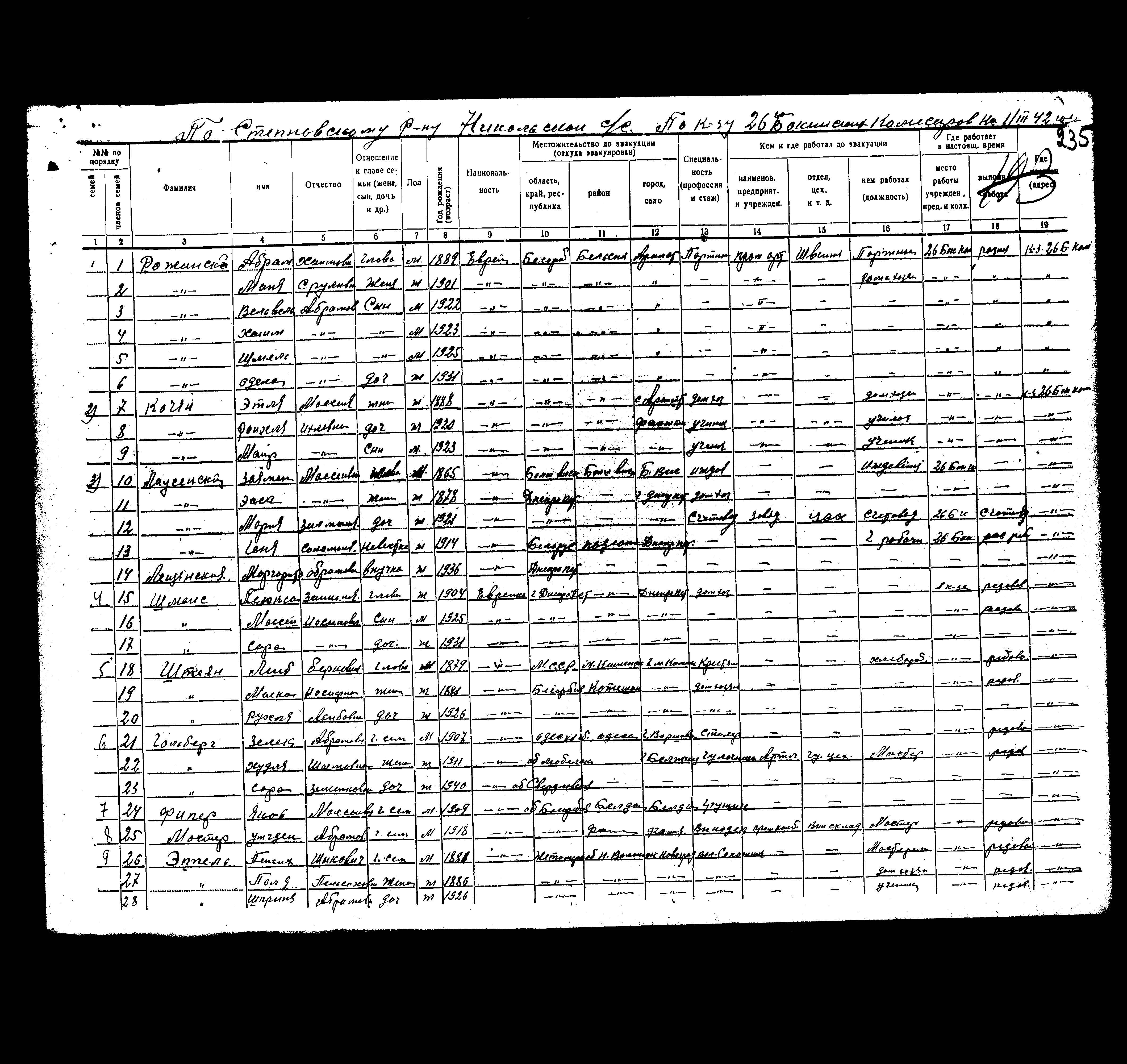 Zalman Lausenski was born, 1865 to Moyesey. He was a dependant and married to Essa. Prior to WWII he lived in Bolshaya Viska, Ukraine (USSR). During the war he was in Stepnoye, Russia (USSR). Zalman was registered following the evacuation/ in the interior of the Soviet Union.