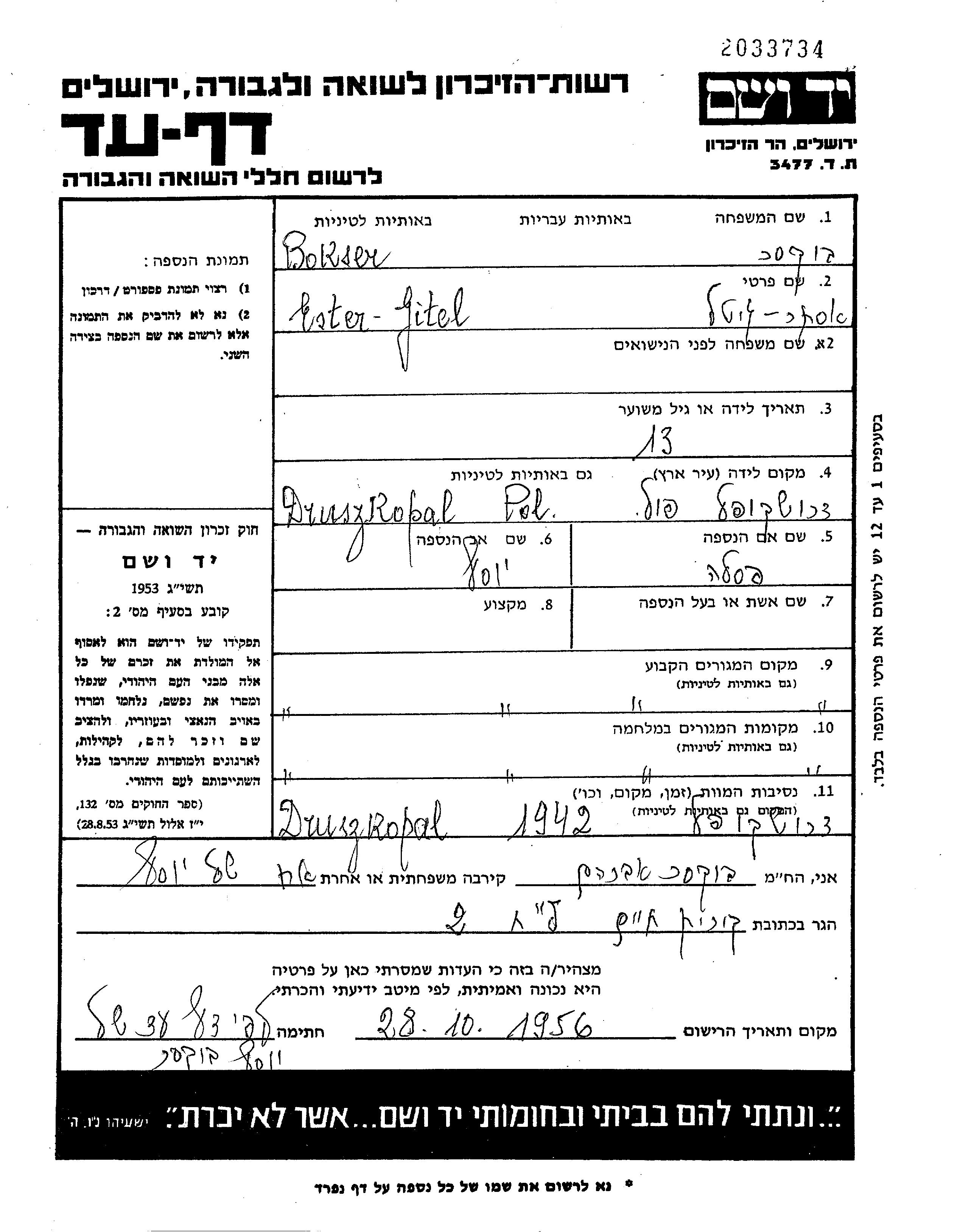 Ester Gitel Bokser was born in Druszkopol, Poland to Yosef and Pesla. Prior to WWII she lived in Druszkopol, Poland. During the war she was in Druszkopol, Poland. Ester Gitel was murdered in the Shoah. Place of death: Druszkopol, Poland, 1942.