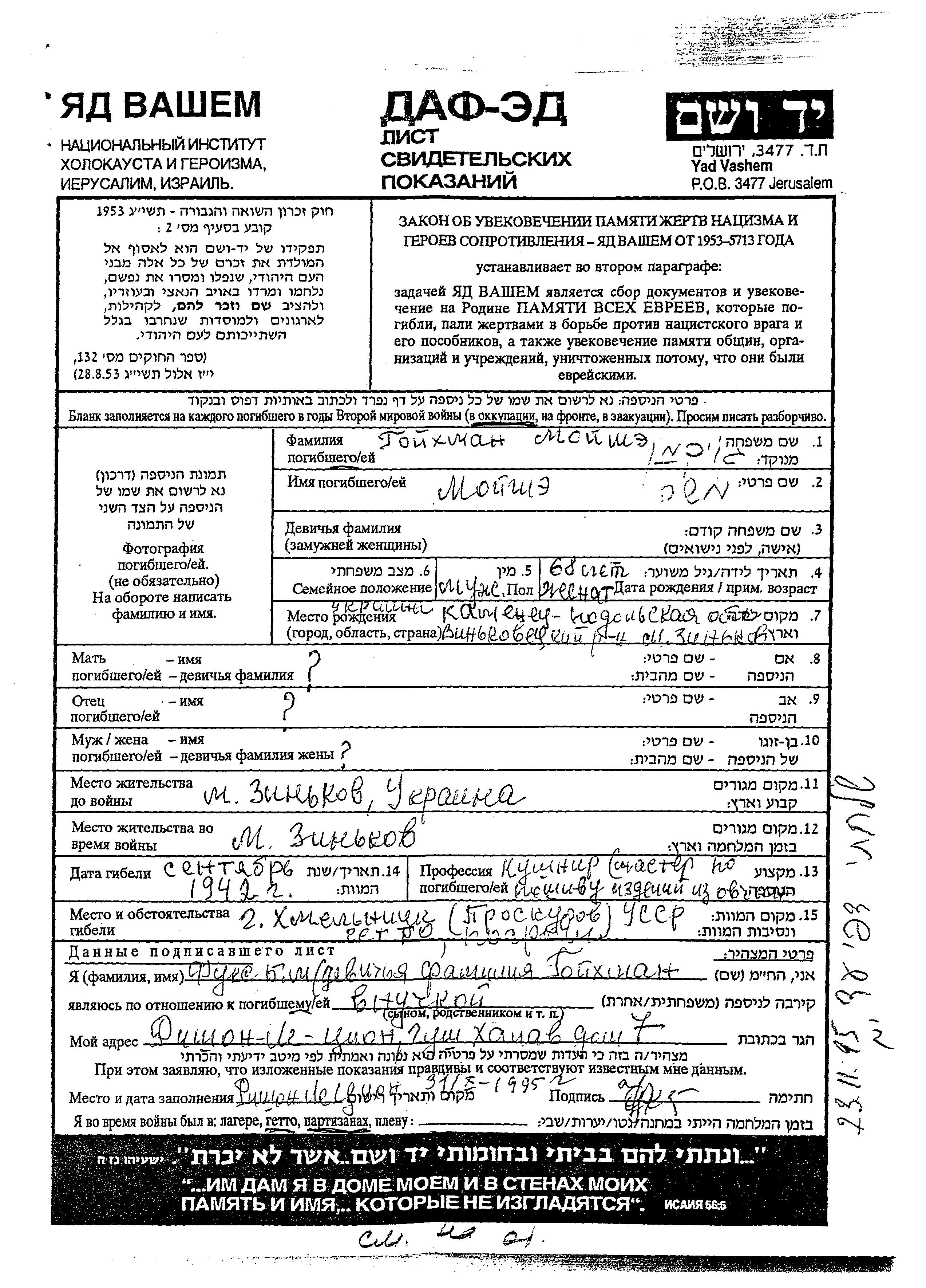 Moishe Goihman was born in Zinkovtsy, Ukraine (USSR). He was a furrier. Prior to WWII he lived in Zinkow, Ukraine (USSR). During the war he was in Zinkow, Ukraine (USSR). Moishe was murdered in the Shoah. Place of death: Proskurow, Ukraine (USSR), 09/1942.