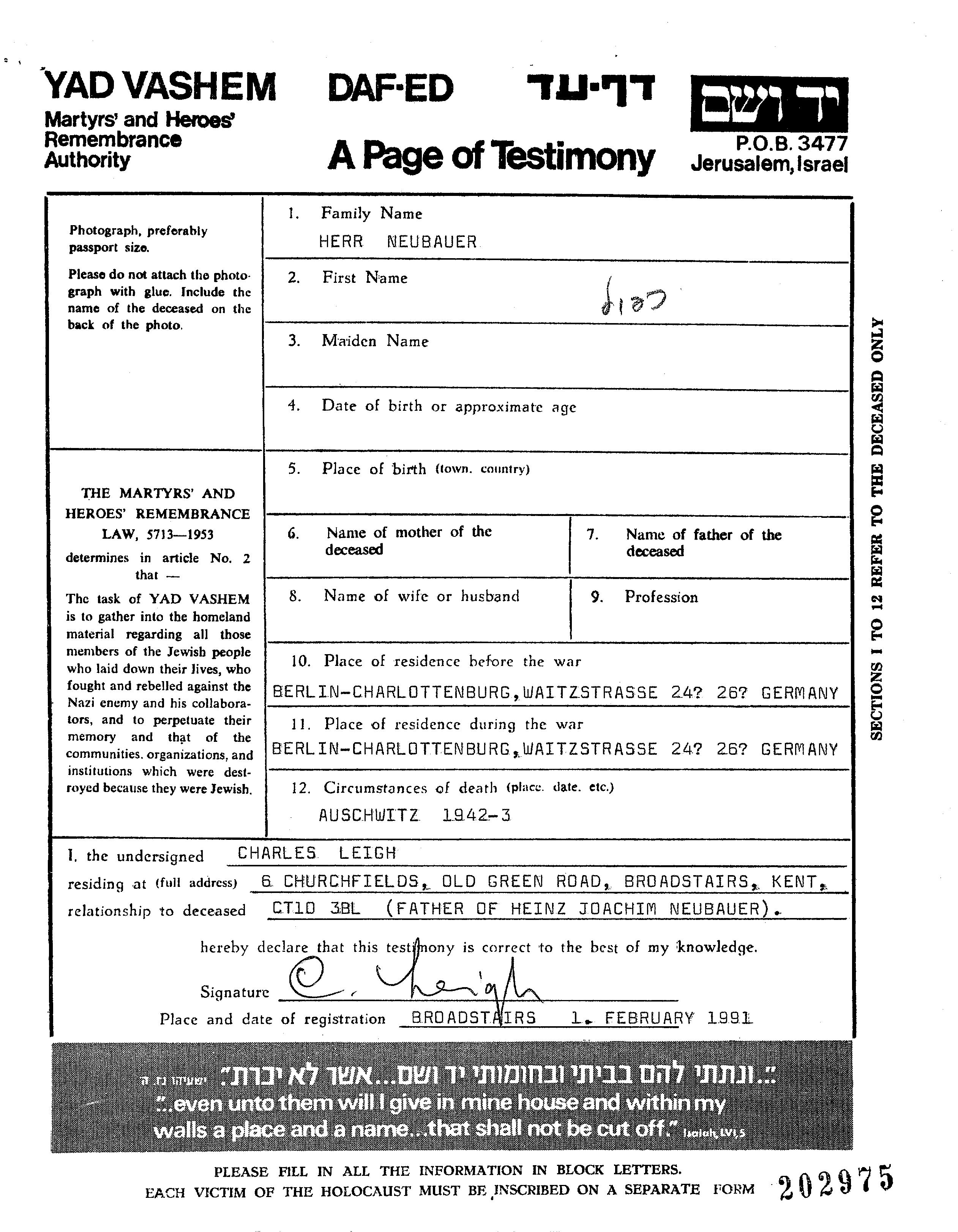 Neubauer First name unknown Berlin, Germany Page of Testimony