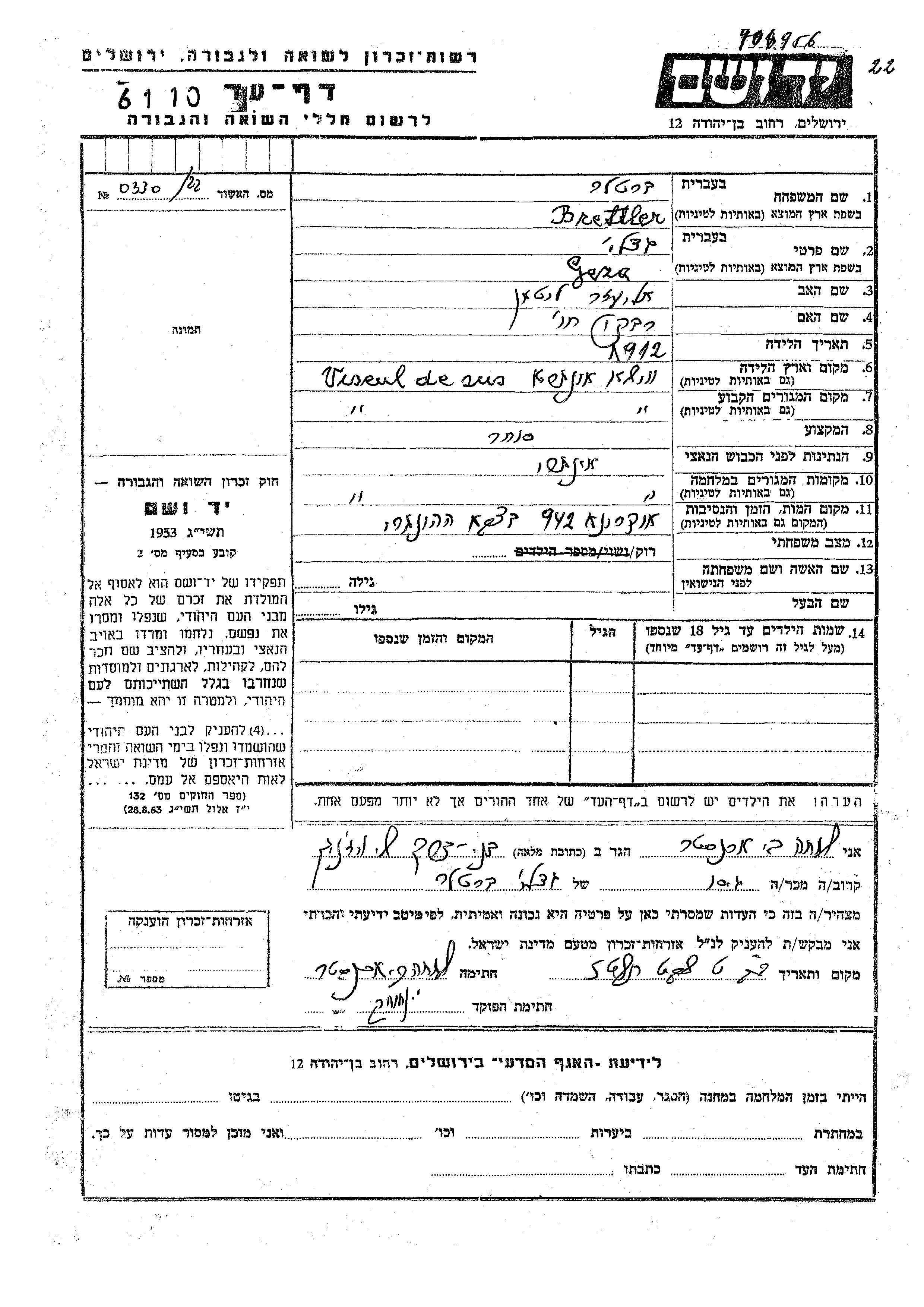 Brettler Gedali Geza 1912 Viseu de Sus, Romania Page of Testimony