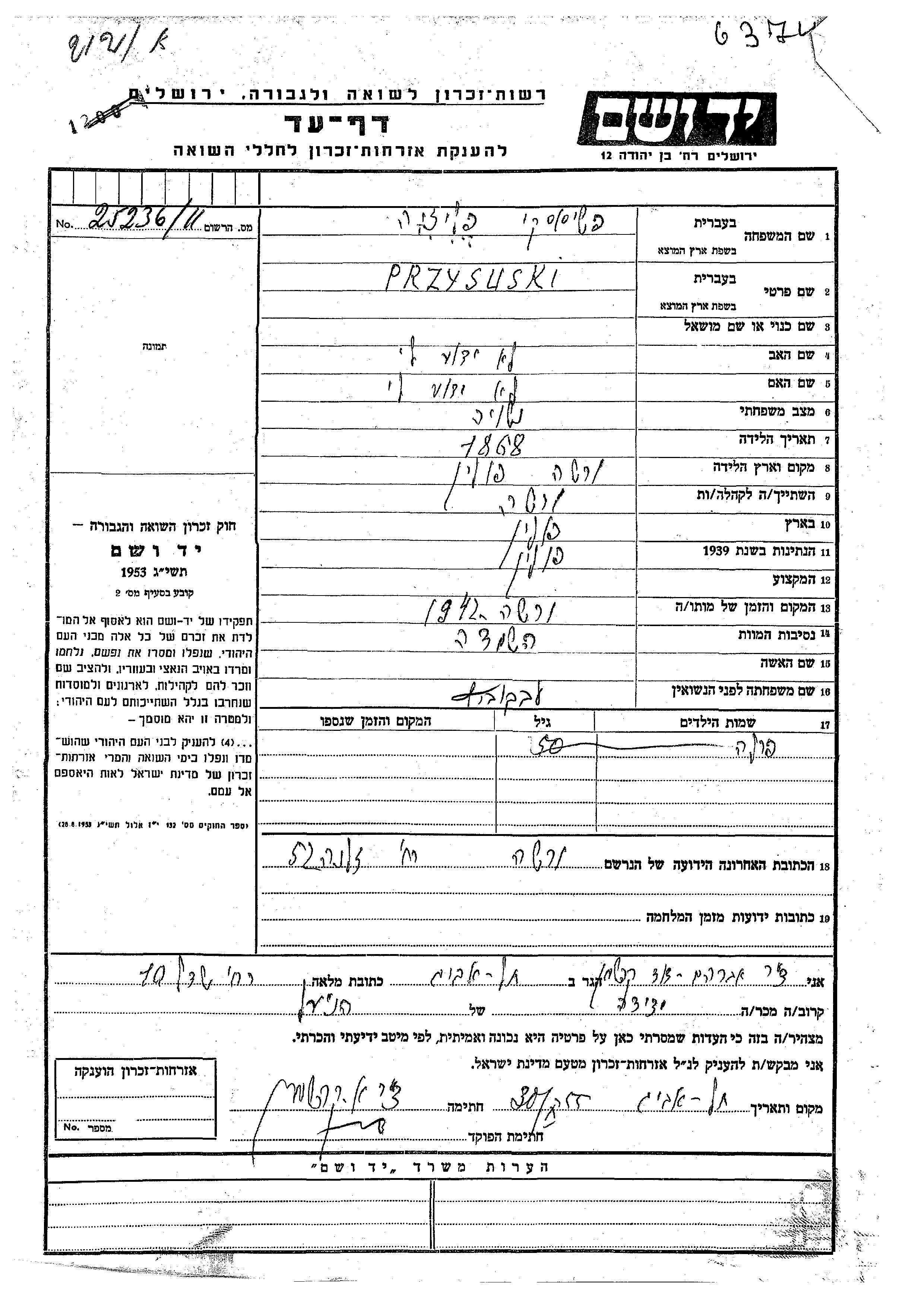 Przysuski Felitzia 1868 Warszawa, Poland Page of Testimony