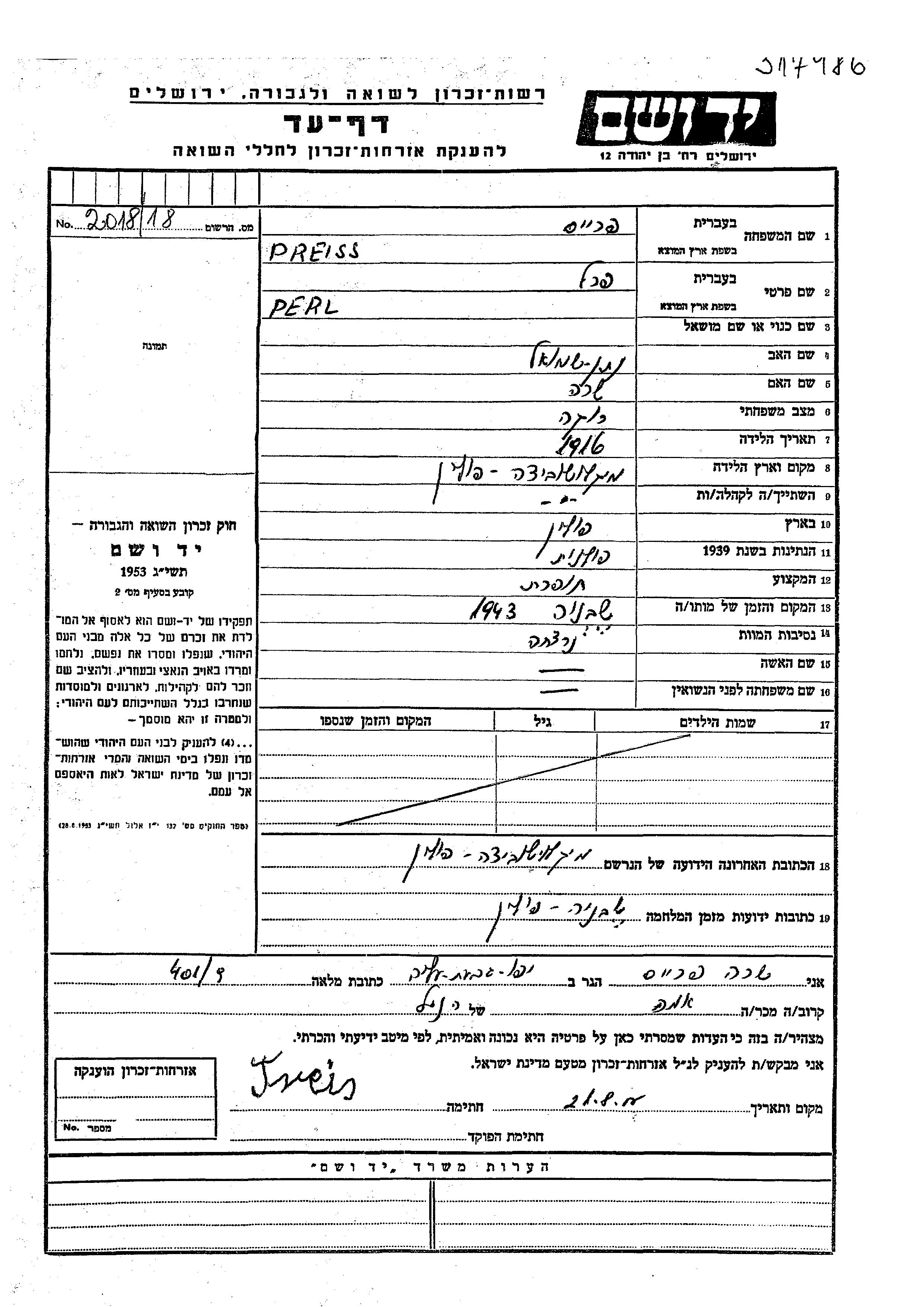 Perl Preiss was born in Mikluszowice, Poland, 1916 to Natan Shmuel and Sara. She was a seamstress and single. Prior to WWII she lived in Mikluszowice, Poland. During the war she was in Szebnie, Poland. Perl was murdered in the Shoah. Place of death: Szebnie, Poland, 1943.