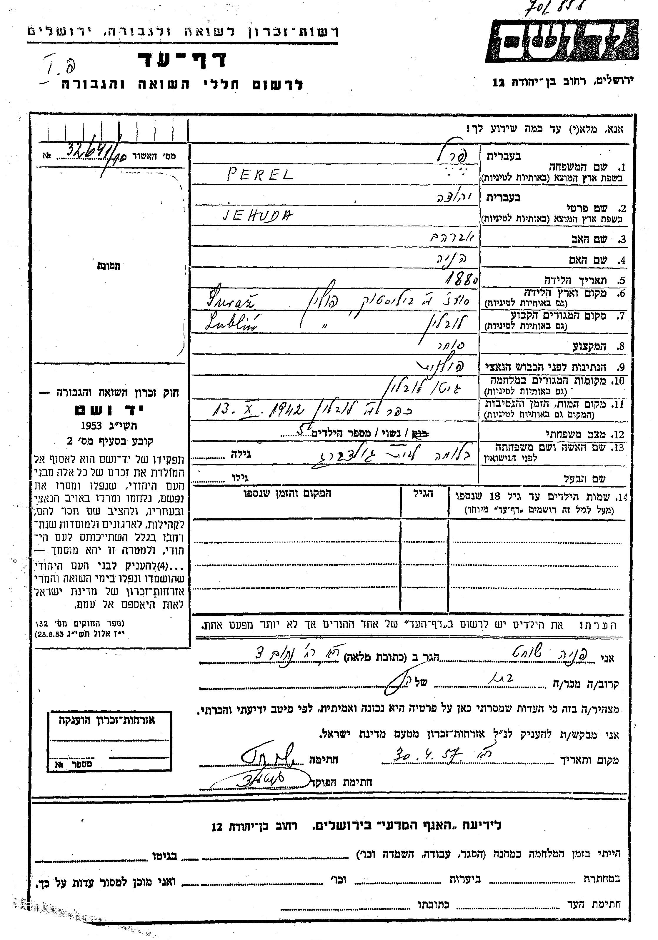 Jehuda Perl was born in Suraz, Poland, 1880 to Avraham and Henia. He was a merchant and married to Bluma nee Goldberg. Prior to WWII he lived in Lublin, Poland. During the war he was in Lublin, Poland. Jehuda was murdered in the Shoah. Place of death: Lublin, Poland, 13/10/1942.