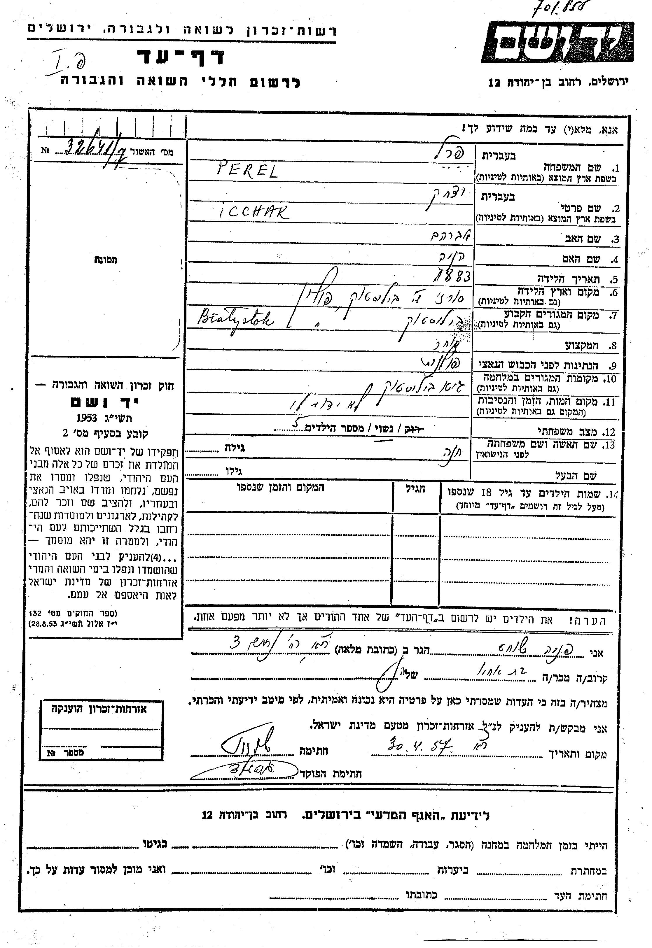 Icchak Perl was born in Suraz, Poland, 1883 to Avraham and Henia. He was a merchant and married to Khana. Prior to WWII he lived in Bialystok, Poland. During the war he was in Bialystok, Poland. Icchak was murdered in the Shoah.