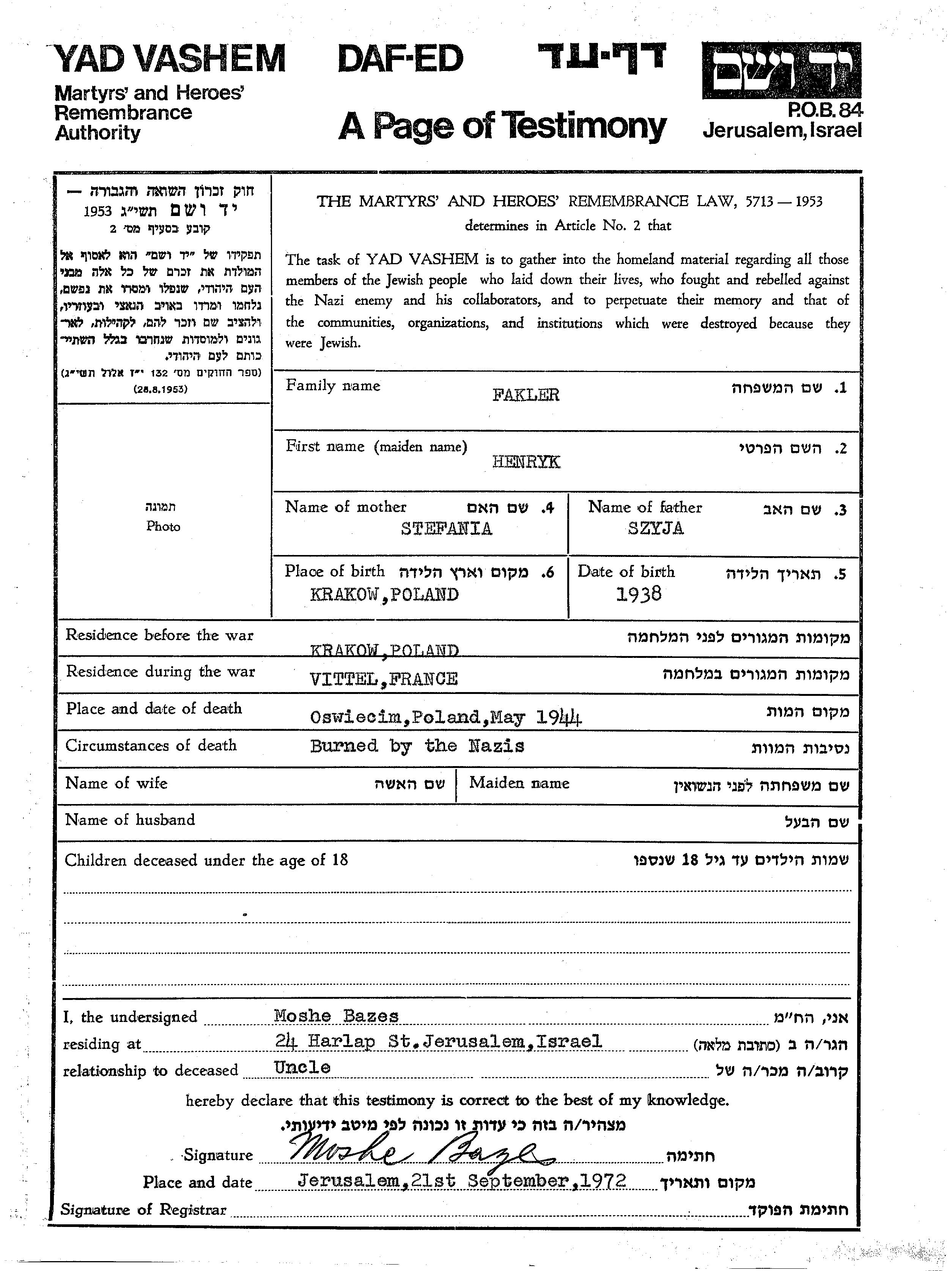 Fakler Henryk 1938 Krakow, Poland Page of Testimony