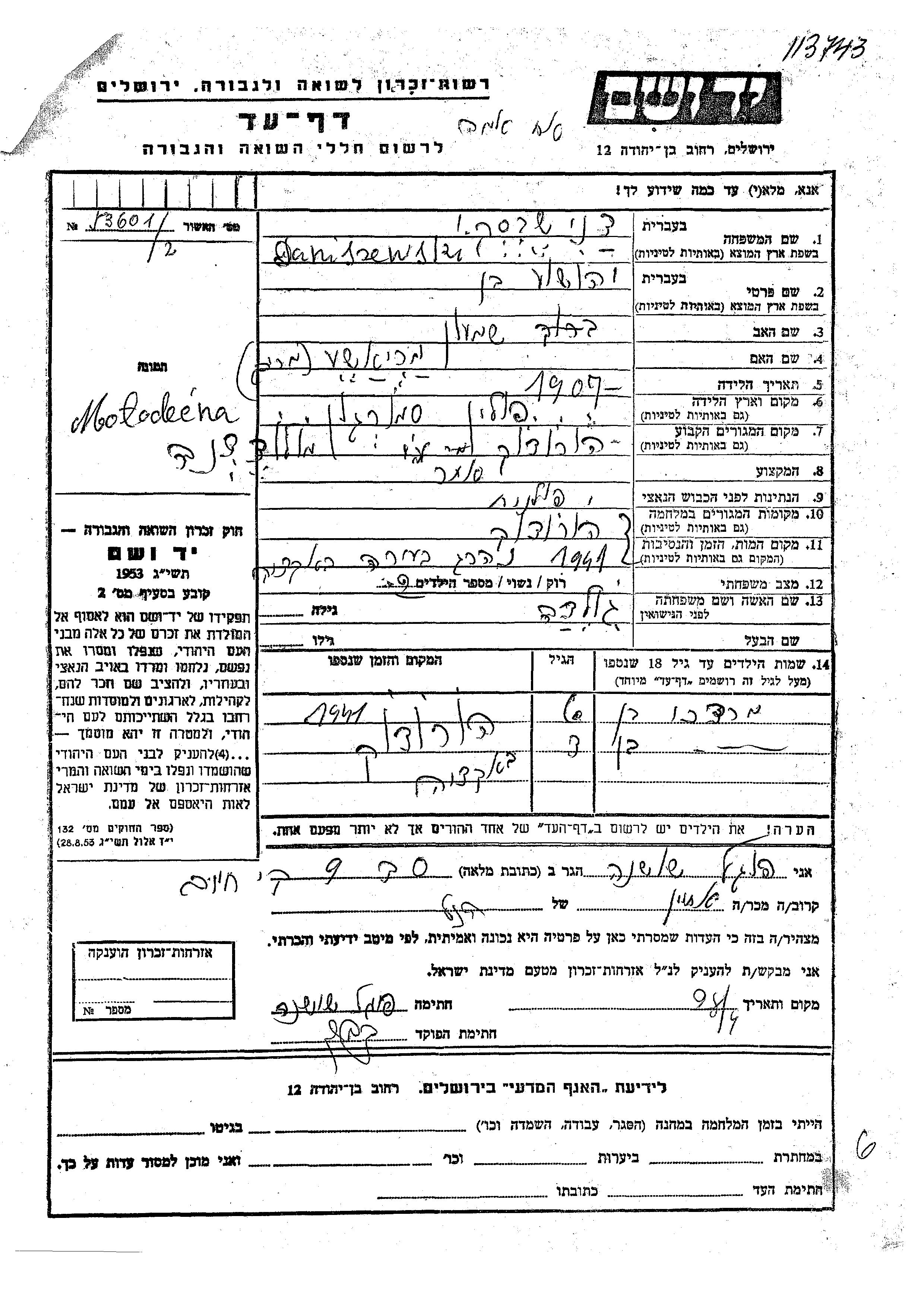 Daniszewski Yehoshua 1907 Horodek, Poland Page of Testimony