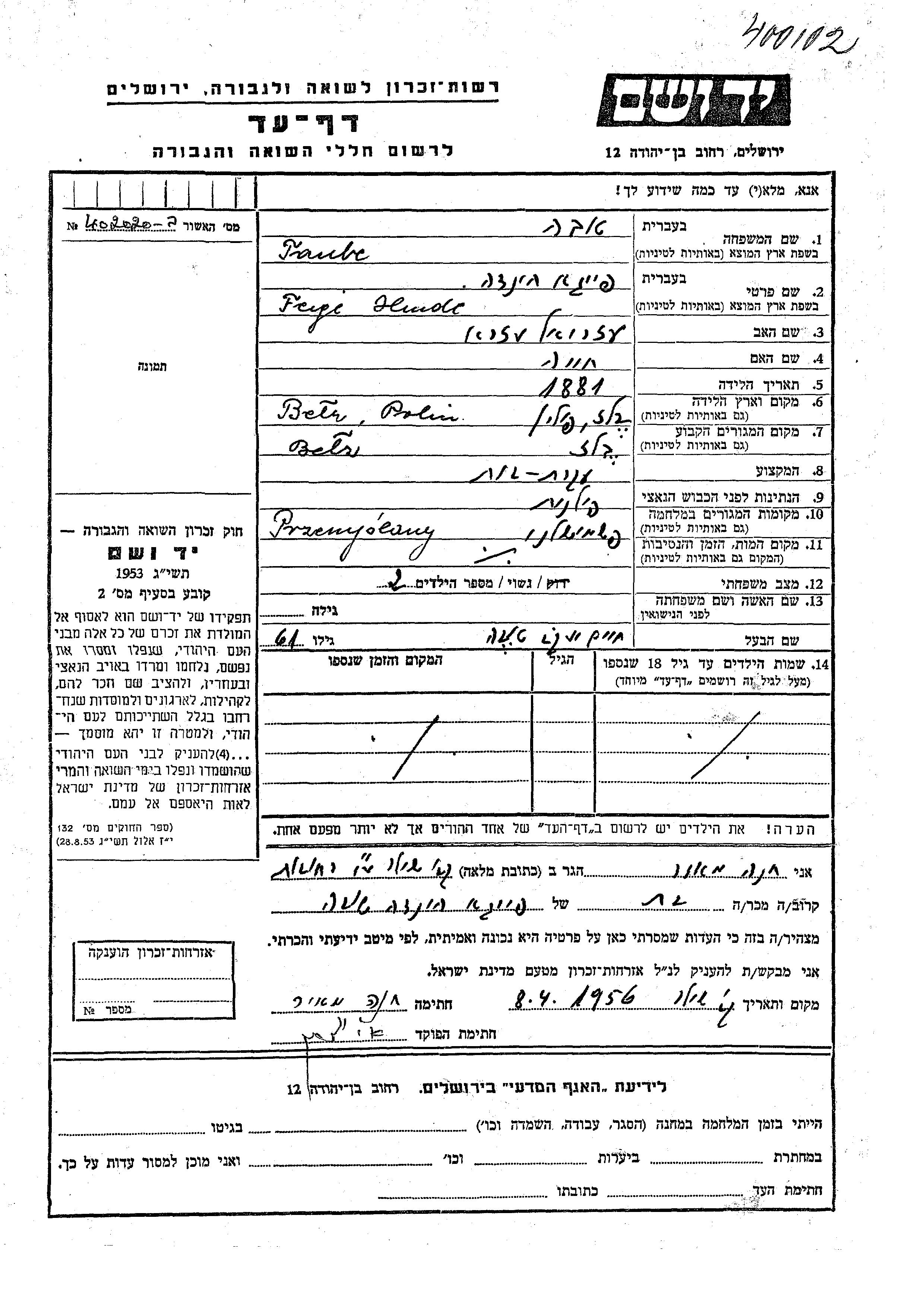 Hinde Feiga Tuba was born in Belz, Poland, 1881 to Azriel Ezra and Khaia. She was a housewife and married to Khaim Yaakov. Prior to WWII she lived in Belz, Poland. During the war she was in Przemyslany, Poland. Hinde Feiga was murdered in the Shoah.