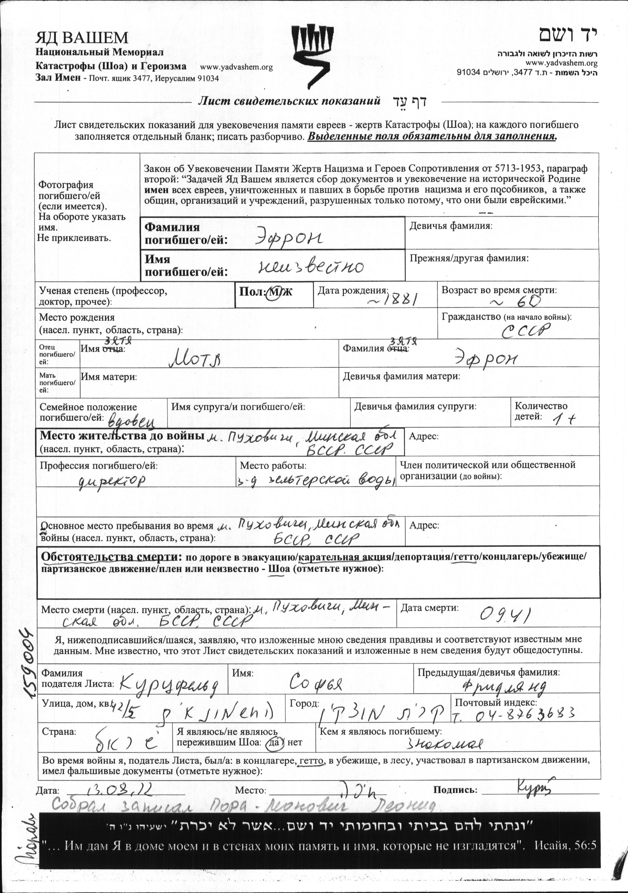 Efron First name unknown 1881 Pukhovichi, Belorussia (USSR) Page of Testimony