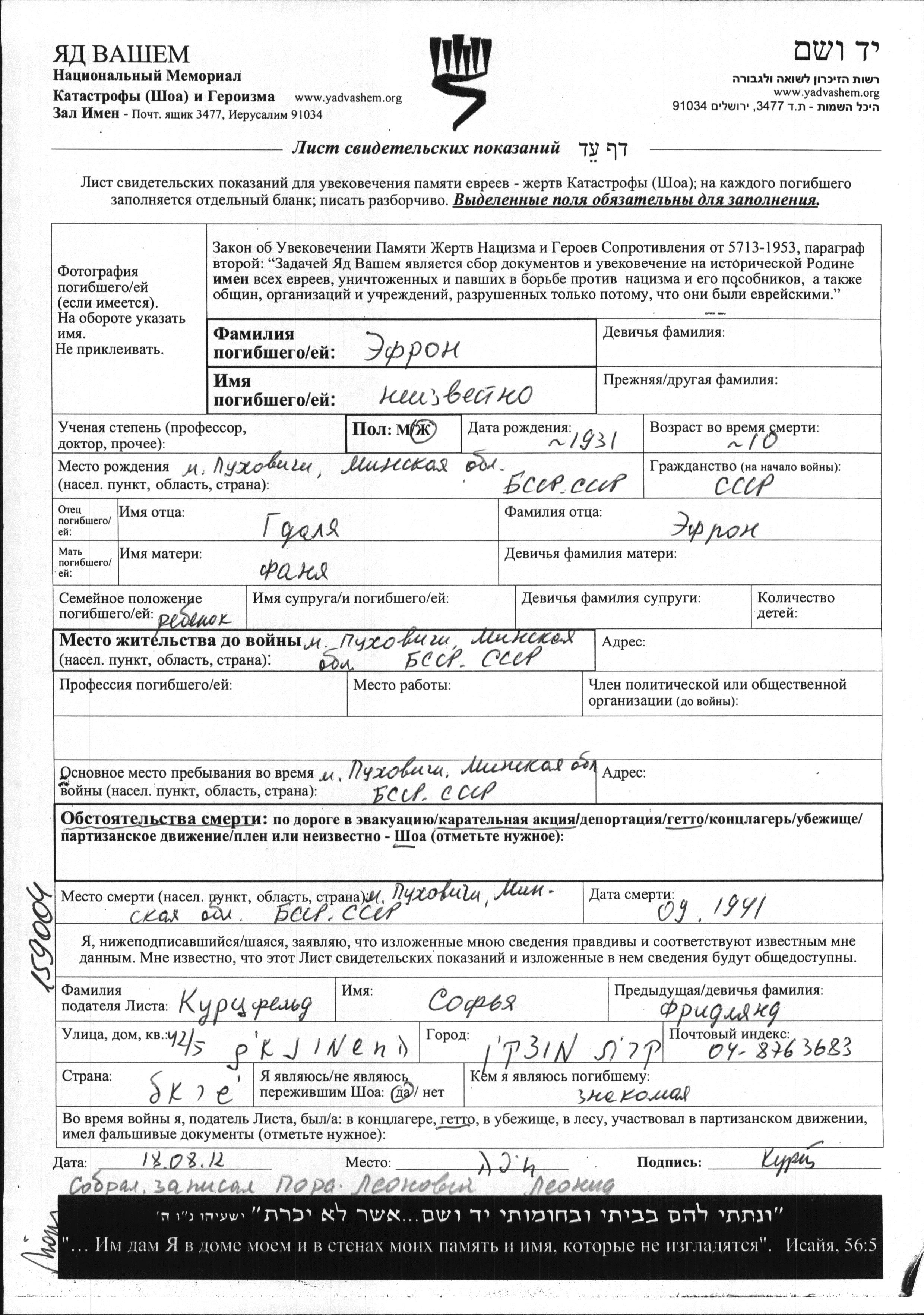 Efron First name unknown 1931 Pukhovichi, Belorussia (USSR) Page of Testimony