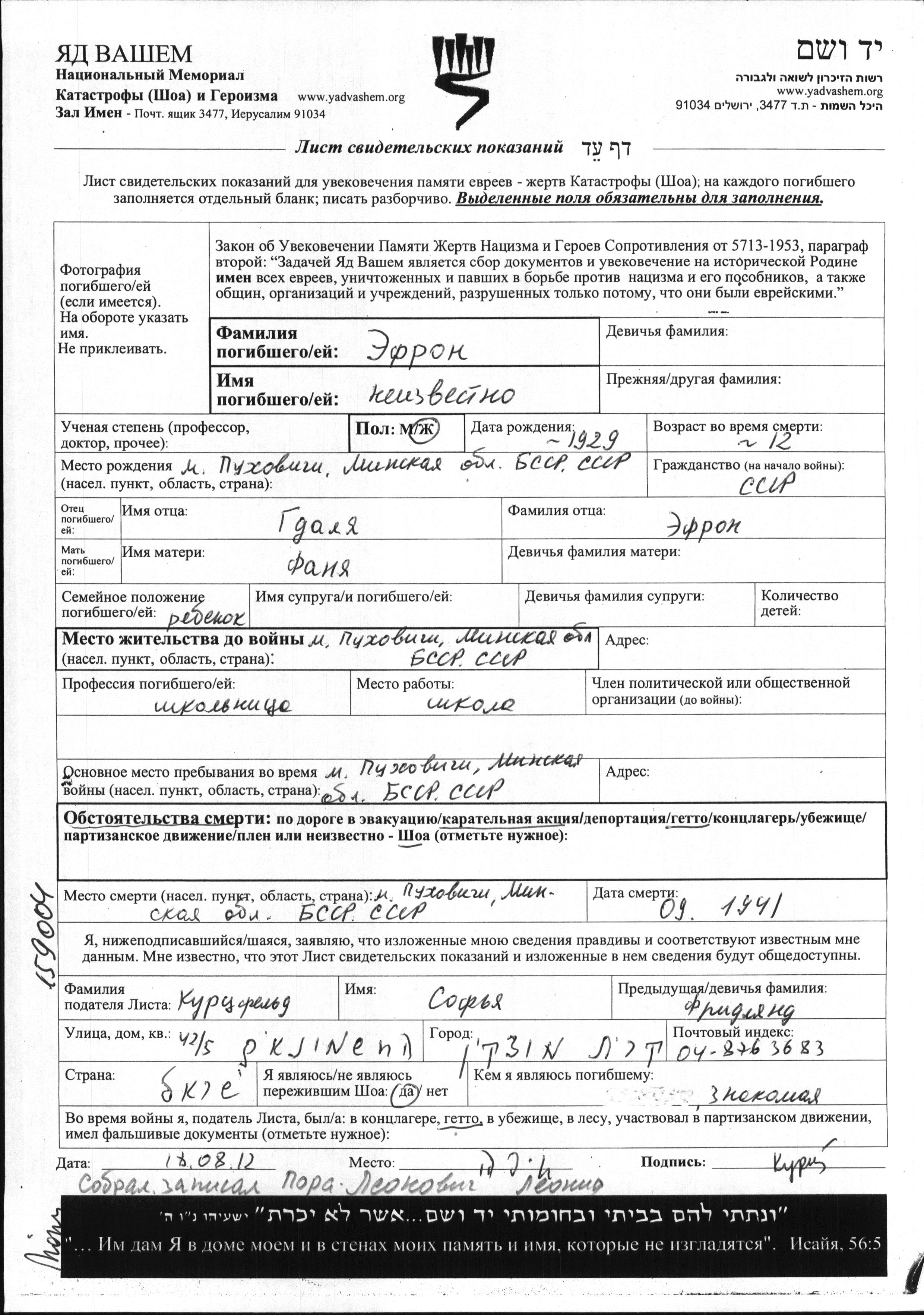 Efron First name unknown 1929 Pukhovichi, Belorussia (USSR) Page of Testimony