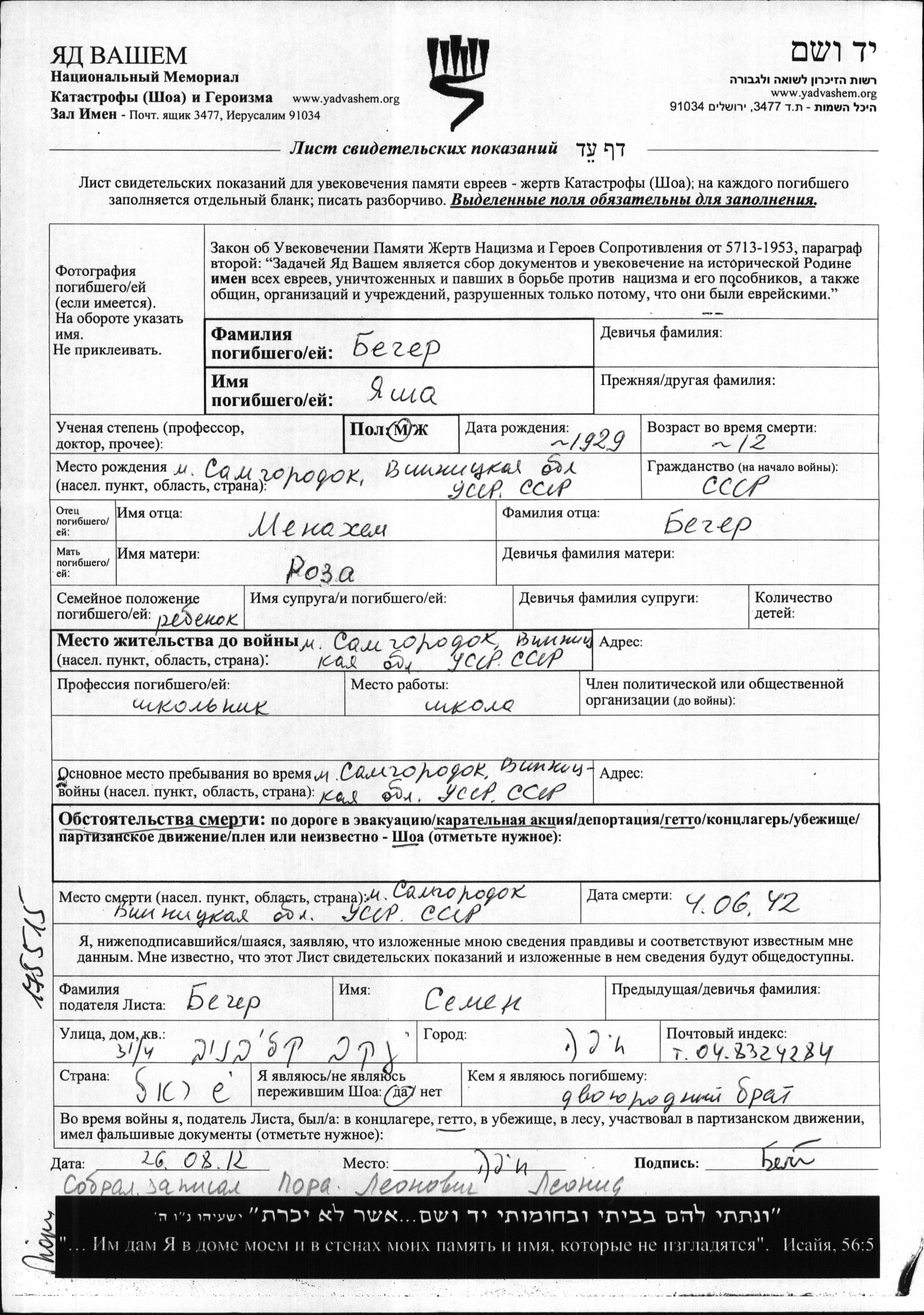 Beger Yasha 1929 Samgorodok, Ukraine (USSR) Page of Testimony