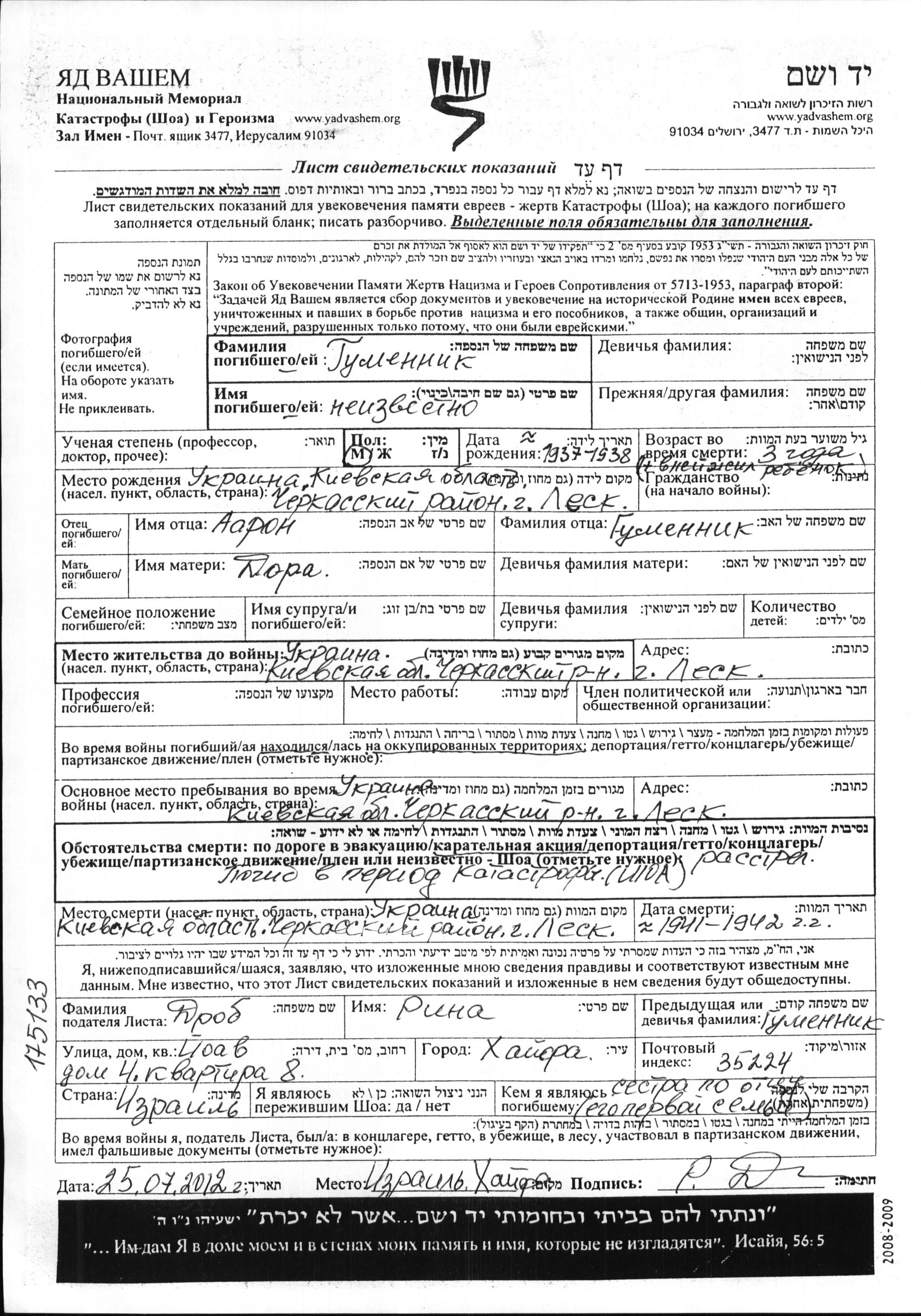 First name unknown Gumennik was born in Lysyanka, Ukraine (USSR), 1938 to Aaron and Dora. He was child. Prior to WWII he lived in Lysyanka, Ukraine (USSR). During the war he was in Lysyanka, Ukraine (USSR). He was murdered in the Shoah. Place of death: Lysyanka, Ukraine (USSR), 1941.