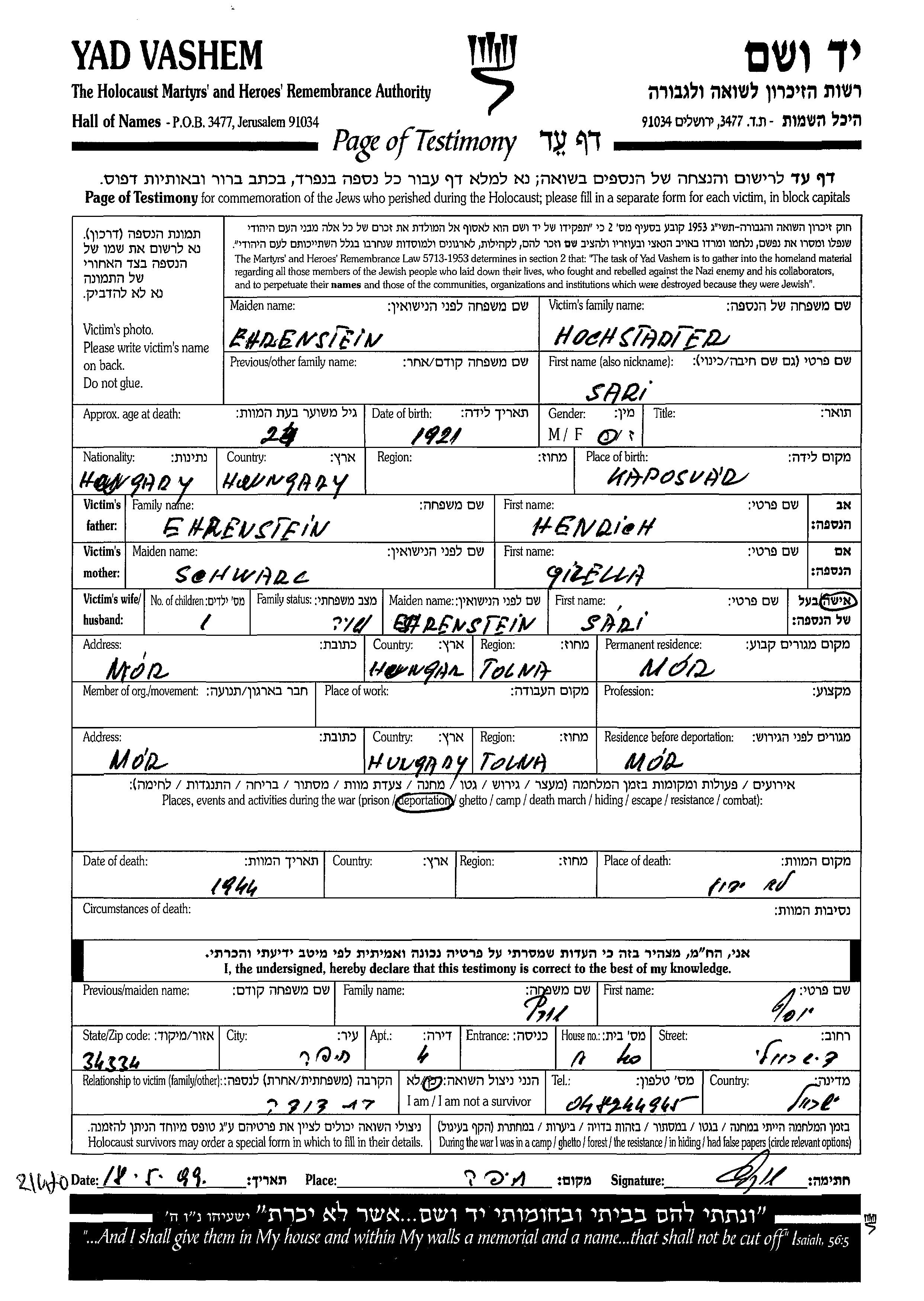 Hochstadter Sari Mor, Hungary Page of Testimony
