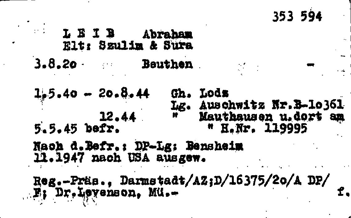 | Lajb | Abram | 1918 | Litzmannstadt, Poland | Mauthausen camp personal card file |