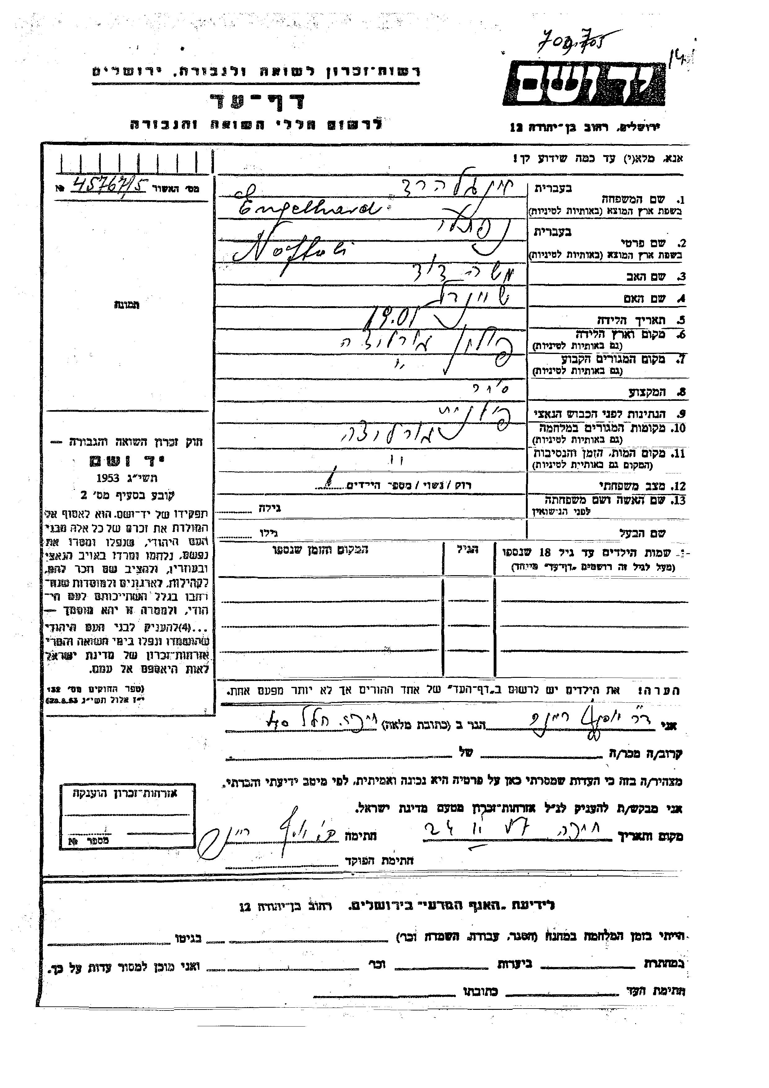 Noftali Engelhard was born in Mircze, Poland, 1901 to Moshe David and Sheindl. He was a merchant and married. Prior to WWII he lived in Mircze, Poland. During the war he was in Mircze, Poland. Noftali was murdered in the Shoah. Place of death: Mircze, Poland.