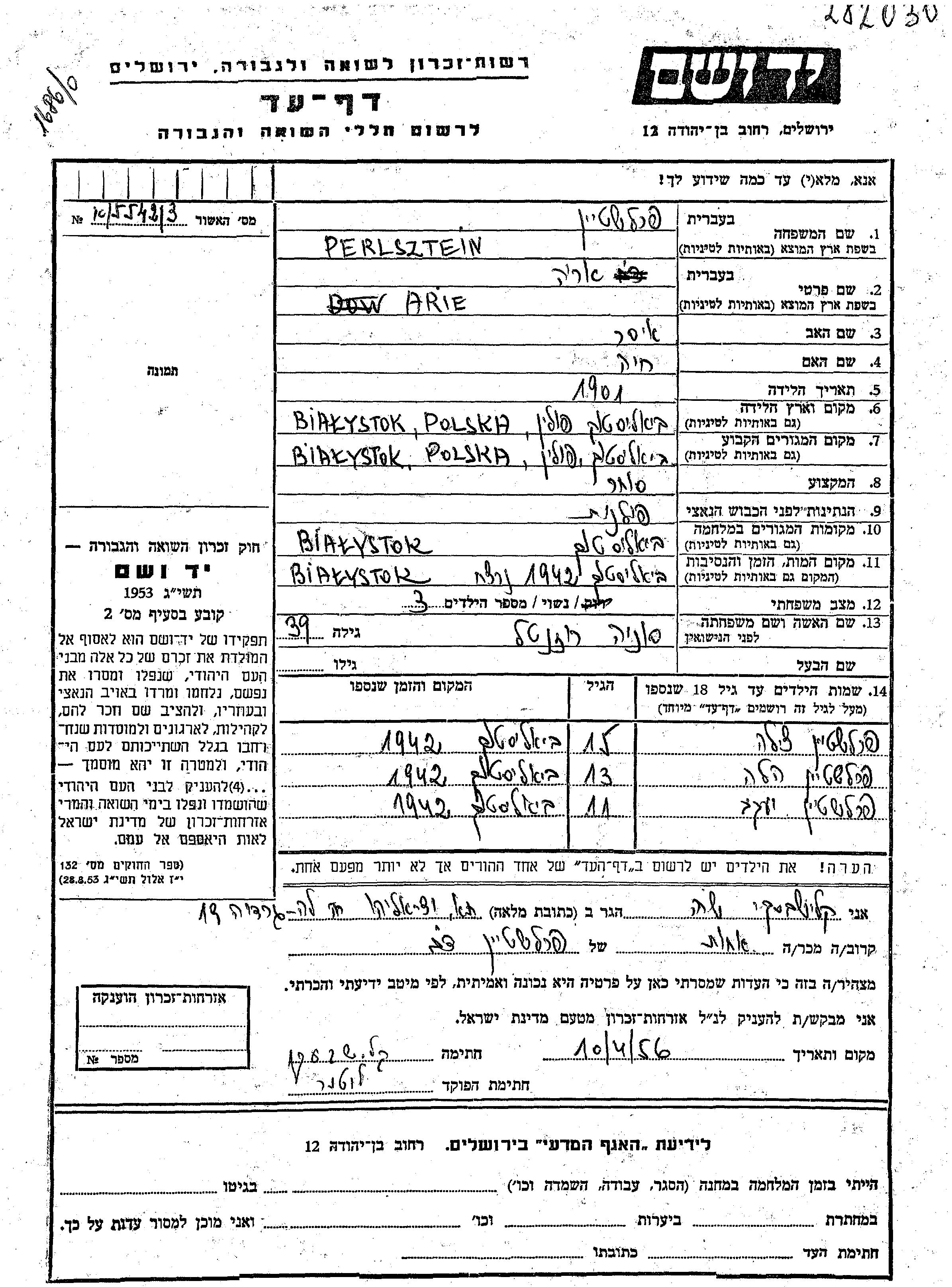 Perlsztein Arie Dov 1901 Bialystok, Poland Page of Testimony