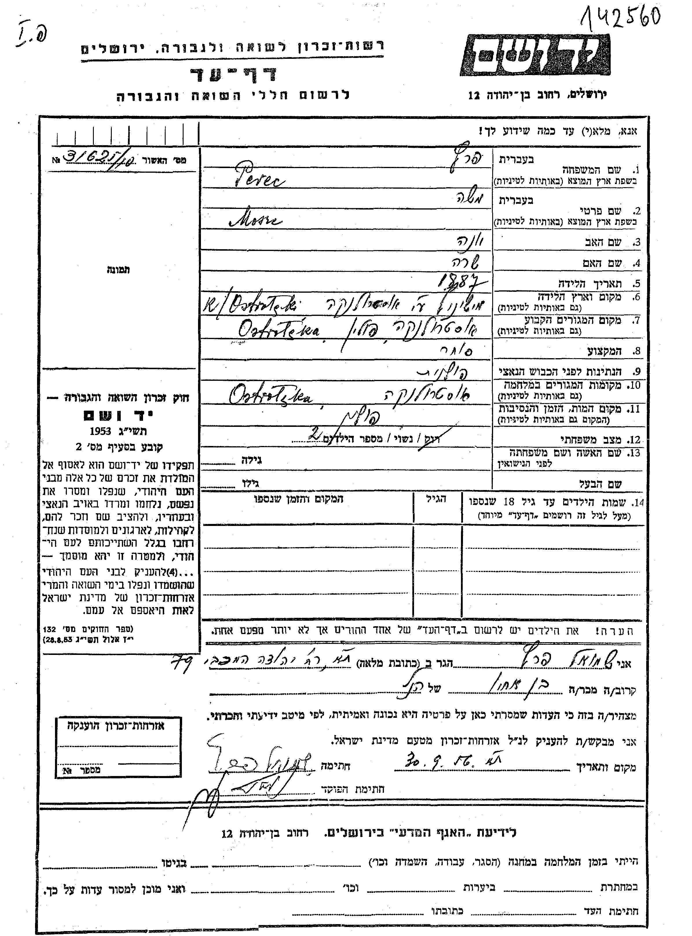 Perec Mosze 1887 Ostroleka, Poland Page of Testimony