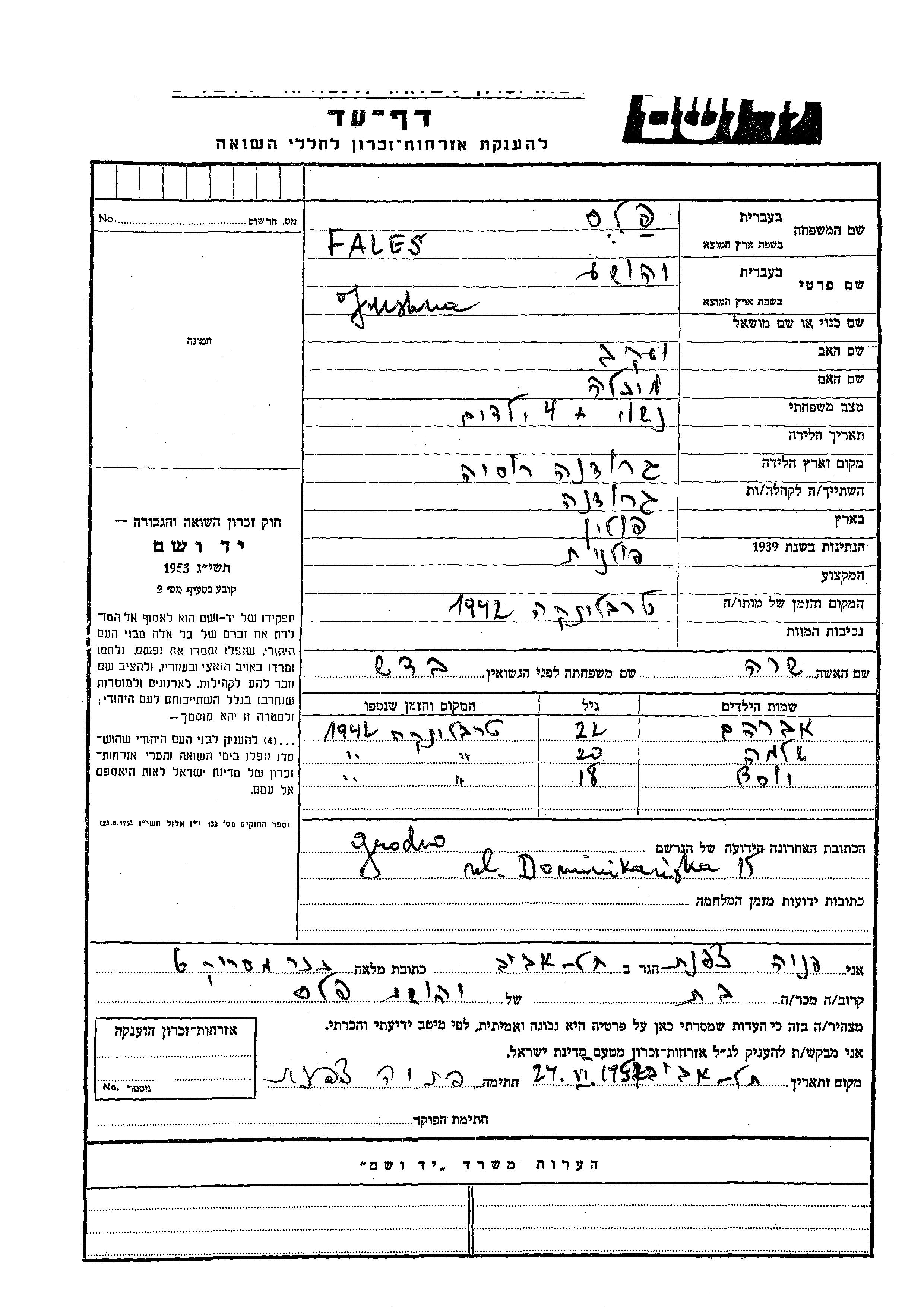 Jushua Fales was born in Grodno, Poland to Yaakov and Mikhla. He was married to Sara nee Badash. Prior to WWII he lived in Grodno, Poland.