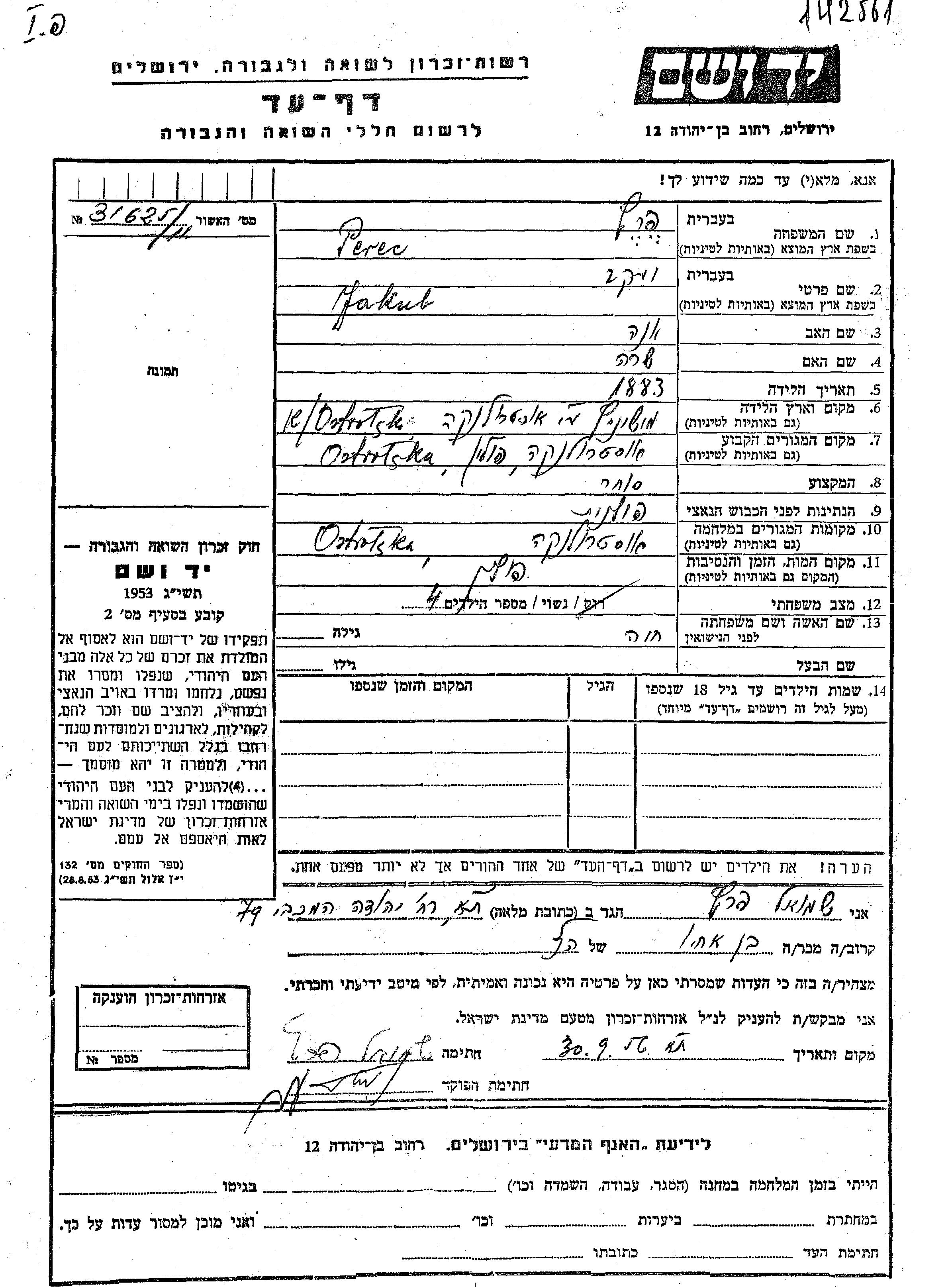 Perec Jakub 1883 Ostroleka, Poland Page of Testimony