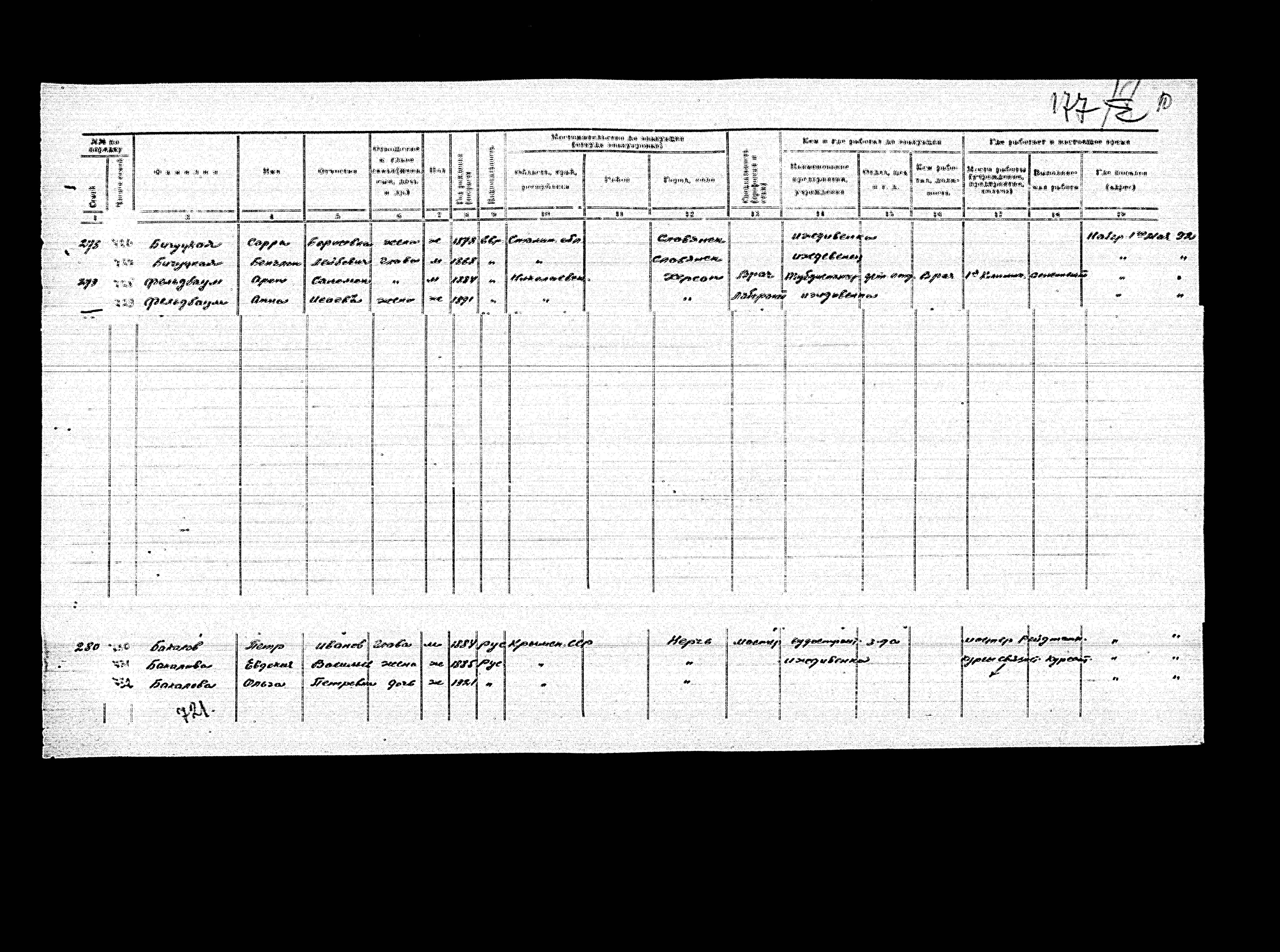 Sarra Bichutzkaya was born, 1878 to Boris. She was a dependant and married to Benemen. Prior to WWII she lived in Slavyansk, Ukraine (USSR). During the war she was in Astrakhan, Russia (USSR). Sarra was registered following the evacuation/ in the interior of the Soviet Union.