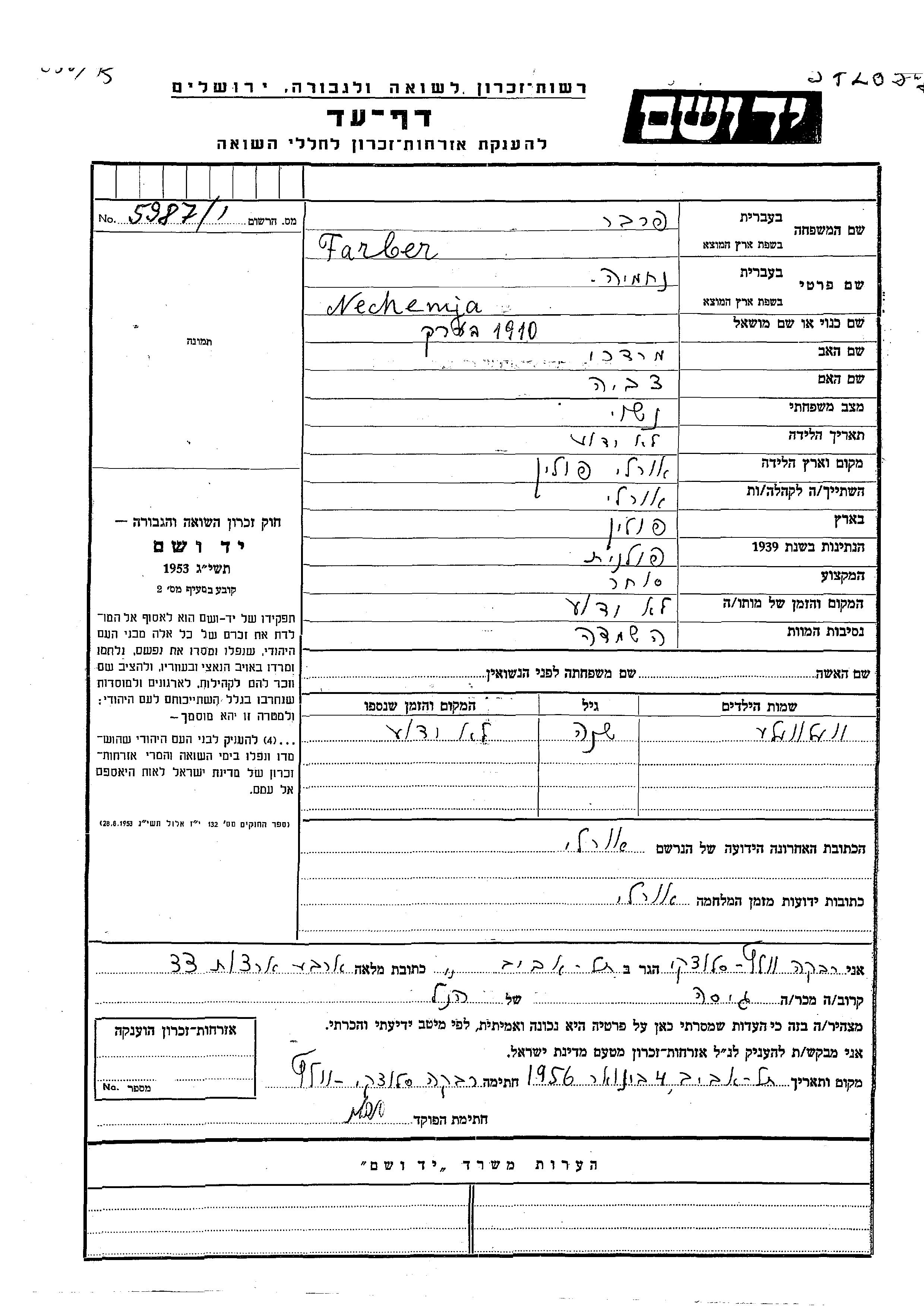 Nechemja Farber was born in Orly, Poland, 1910 to Mordekhai and Tzvia. He was a merchant and married. Prior to WWII he lived in Orly, Poland. During the war he was in Orly, Poland. Nechemja was murdered in the Shoah.