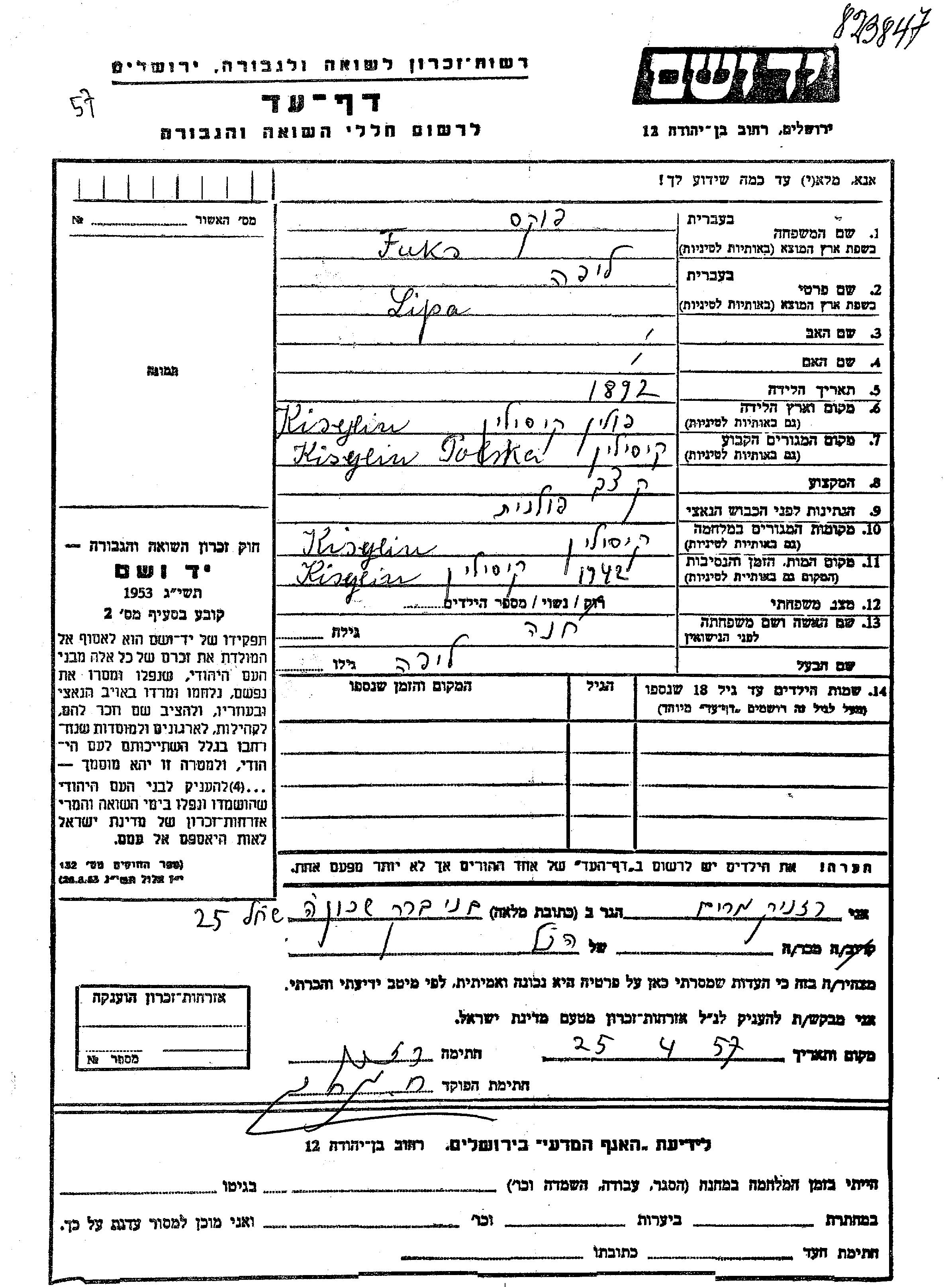 Lipa Fuks was born in Kisylin, Poland, 1892. He was a butcher and married to Khana. Prior to WWII he lived in Kisylin, Poland. During the war he was in Kisylin, Poland. Lipa was murdered in the Shoah. Place of death: Kisylin, Poland, 1942.