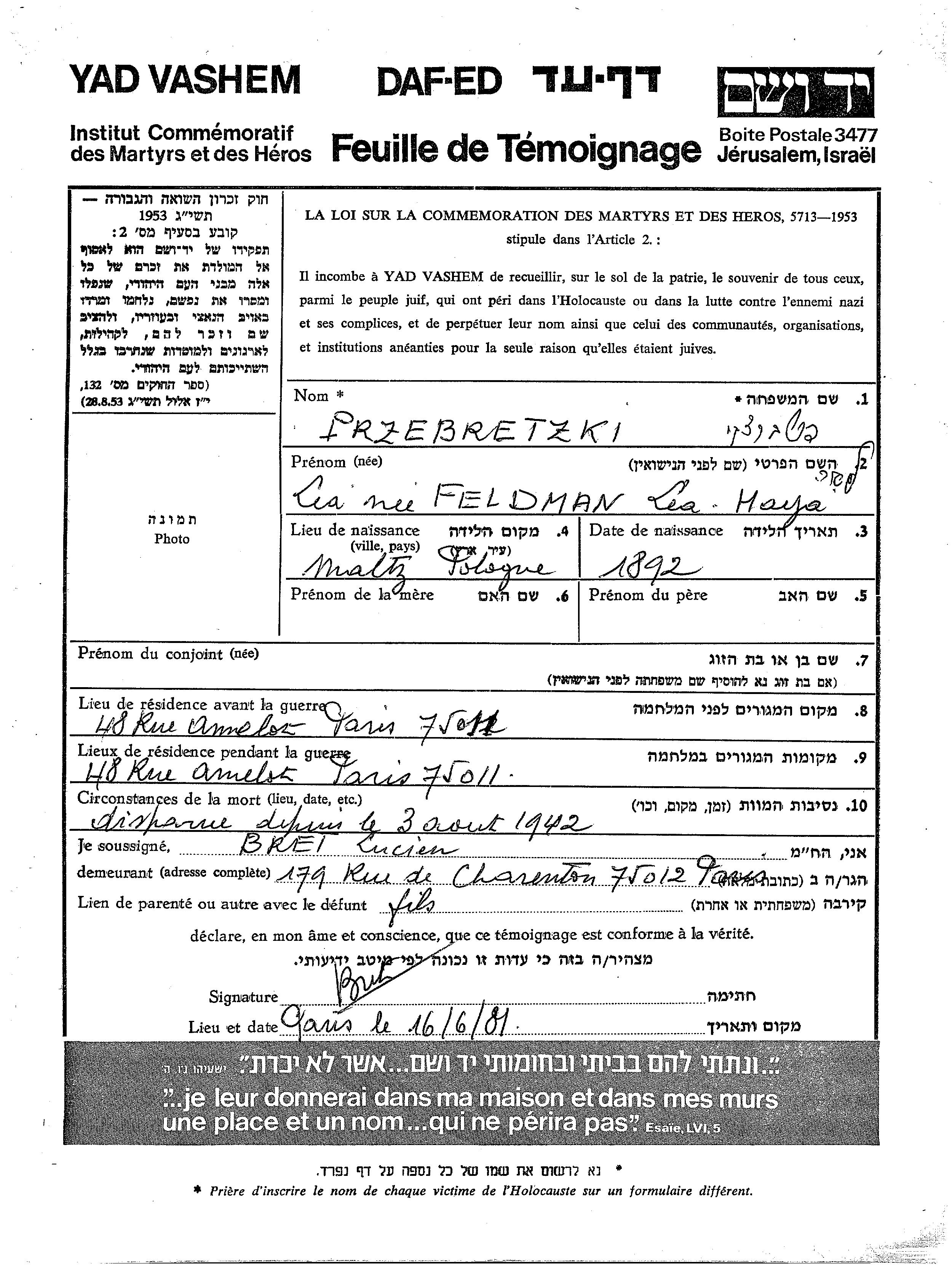 Haya Lea Przebretzki nee Feldman was born in Malcz, Poland, 1892. Prior to WWII she lived in Paris, France. During the war she was in Paris, France. Haya Lea was murdered in the Shoah.