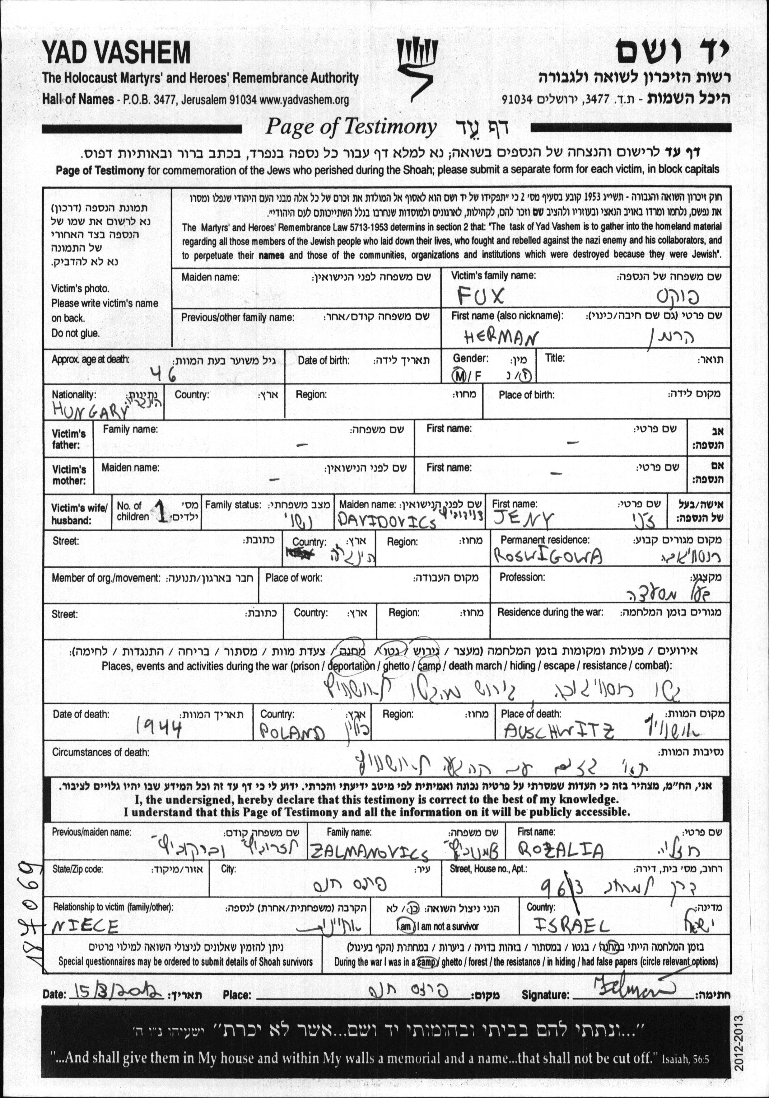 Fux Herman Rosvigovo, Czechoslovakia Page of Testimony