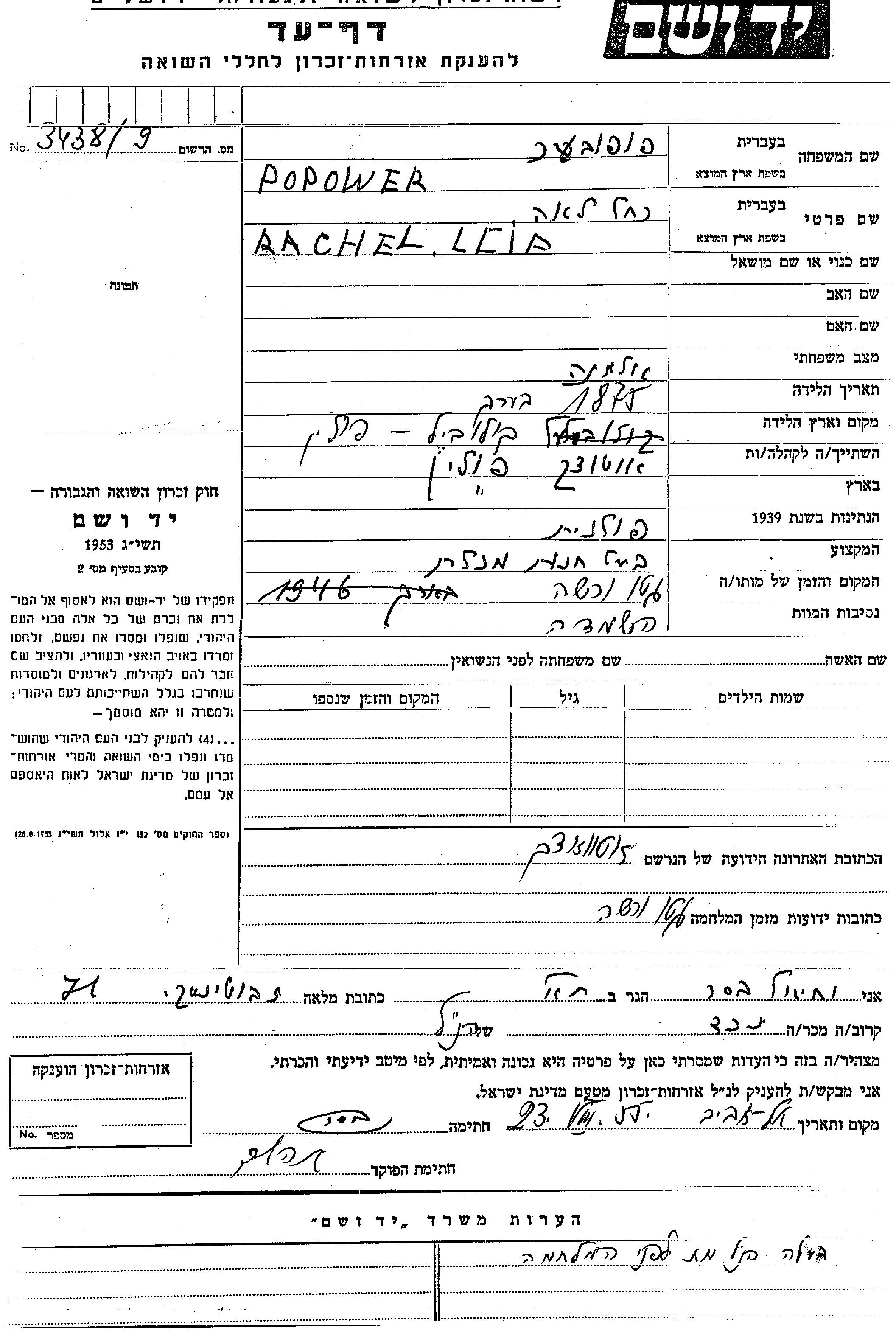 Rachel Leia Popower was born in Kolobeel, Poland, 1875. She was a grocery owner and a widow. Prior to WWII she lived in Otwock, Poland. During the war she was in Warsaw, Poland. Rachel Leia was murdered in the Shoah. Place of death: Warsaw, Poland.