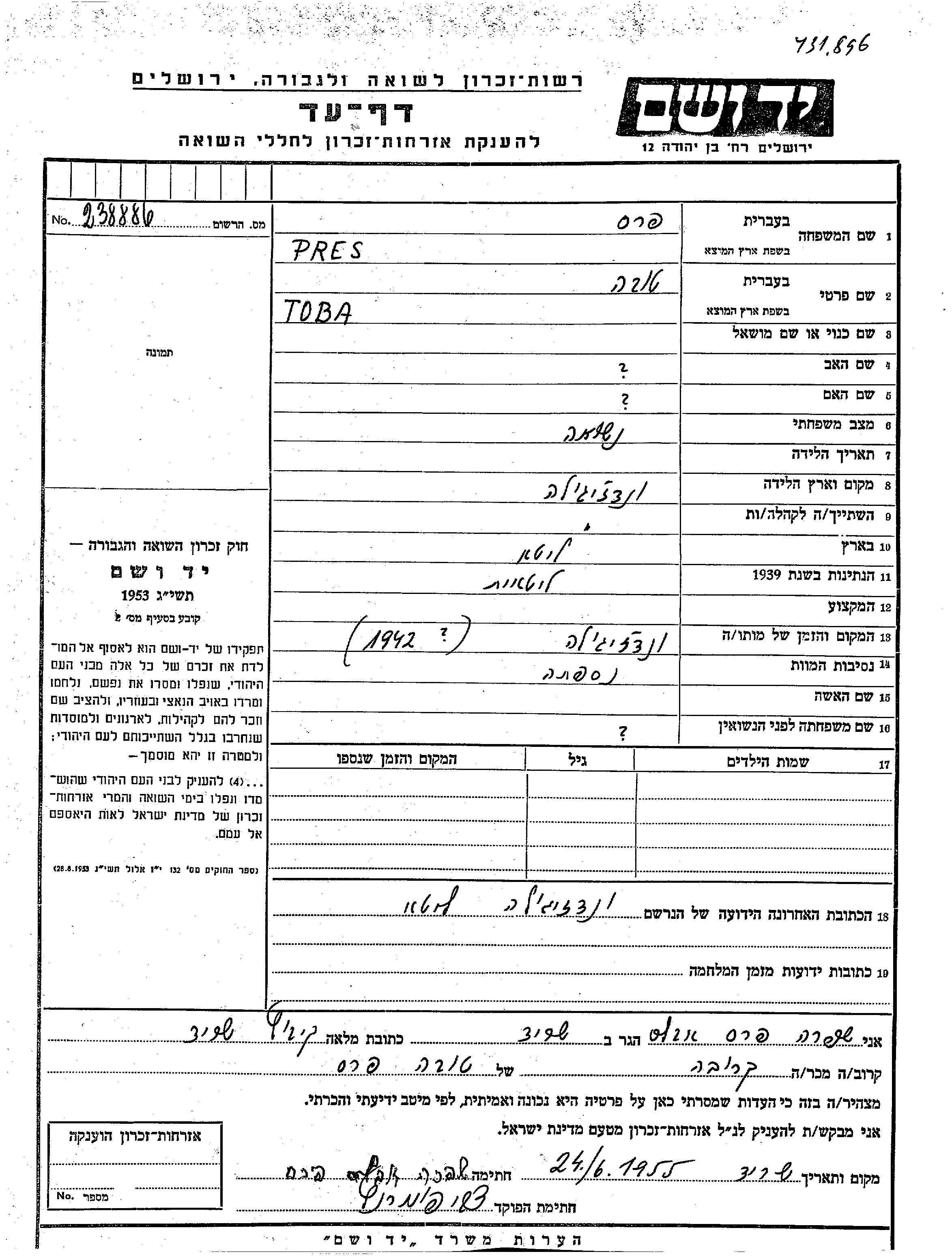 Toba Tova Pres was born in Vandžiogala, Lithuania. She was married. Prior to WWII she lived in Vandžiogala, Lithuania. During the war she was in Vandžiogala, Lithuania. Toba Tova was murdered in the Shoah. Place of death: Vandžiogala, Lithuania, 1942.