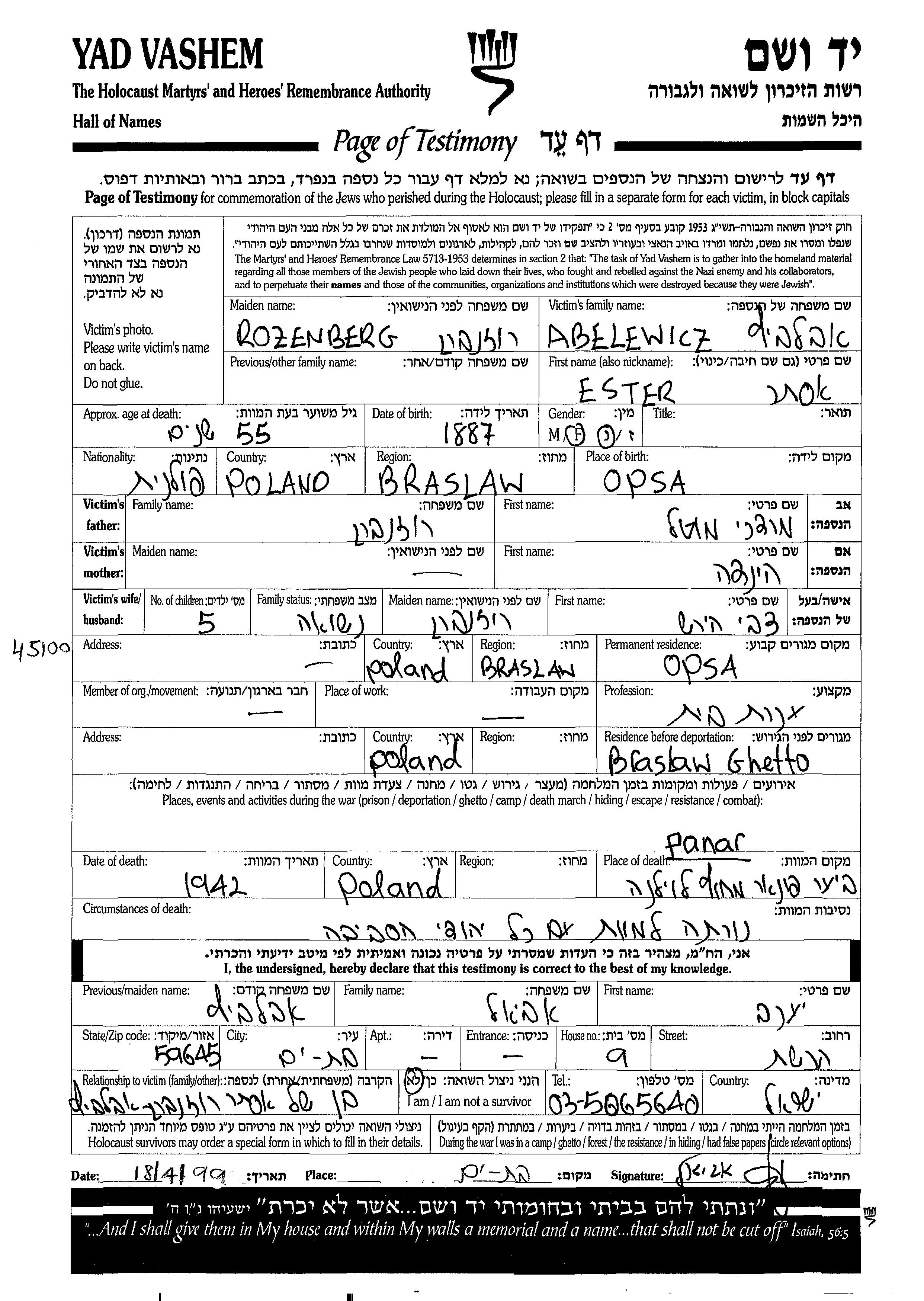 Ester Abelewicz nee Rozenberg was born in Opsa, Poland, 1887 to Mordekhai and Hinda. She was a housewife and married to Tzvi Hirsh. Prior to WWII she lived in Opsa, Poland. During the war she was in Braslaw, Poland. Ester was murdered in the Shoah. Place of death: Panar, Poland, 1942.