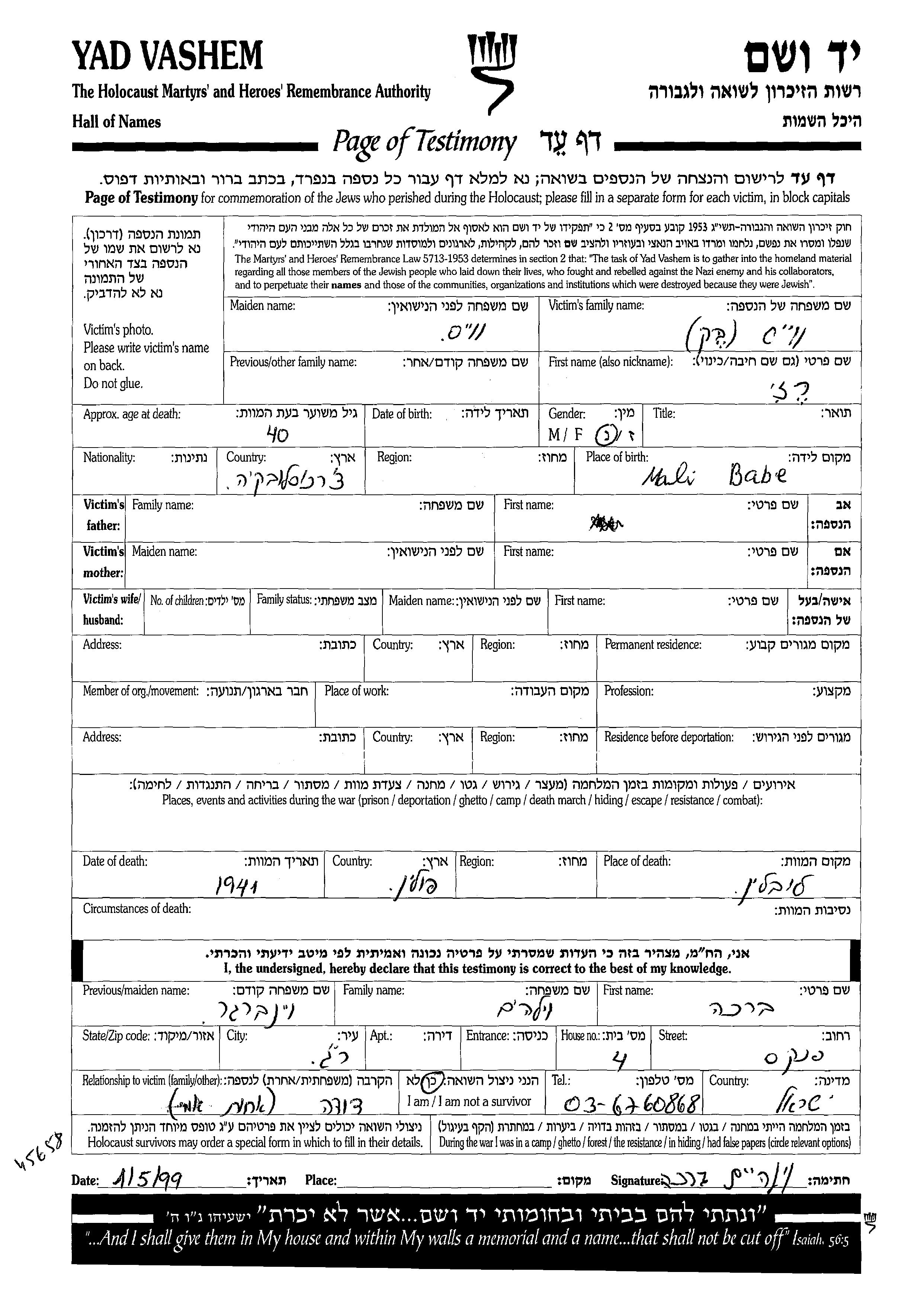 Yad Vashem - Pages of Testimony Names Memorial Collection