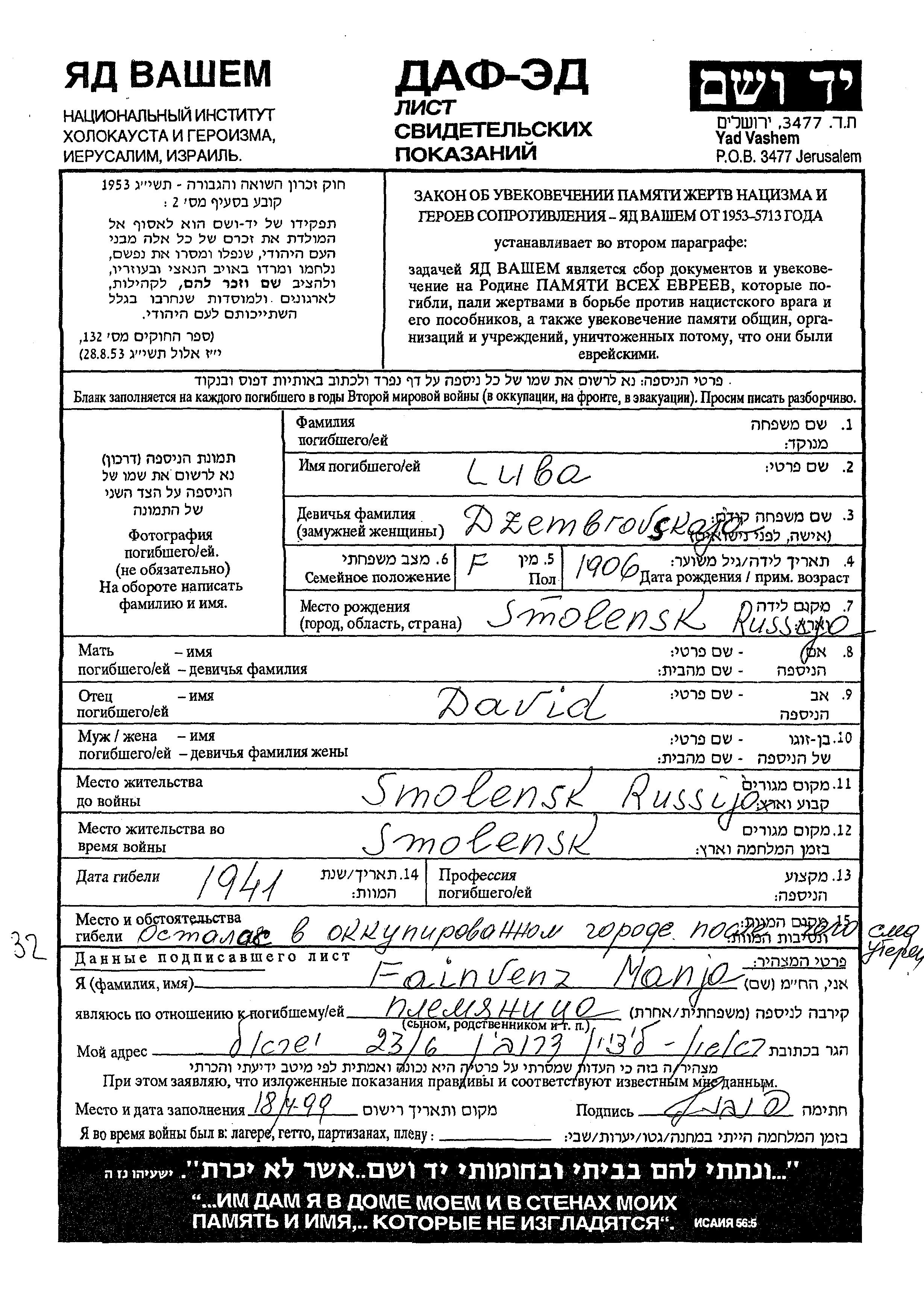 Luba Surname unknown nee Dzembrovskaja was born in Smolensk, Russia (USSR), 1906 to David. Prior to WWII she lived in Smolensk, Russia (USSR). During the war she was in Smolensk, Russia (USSR).