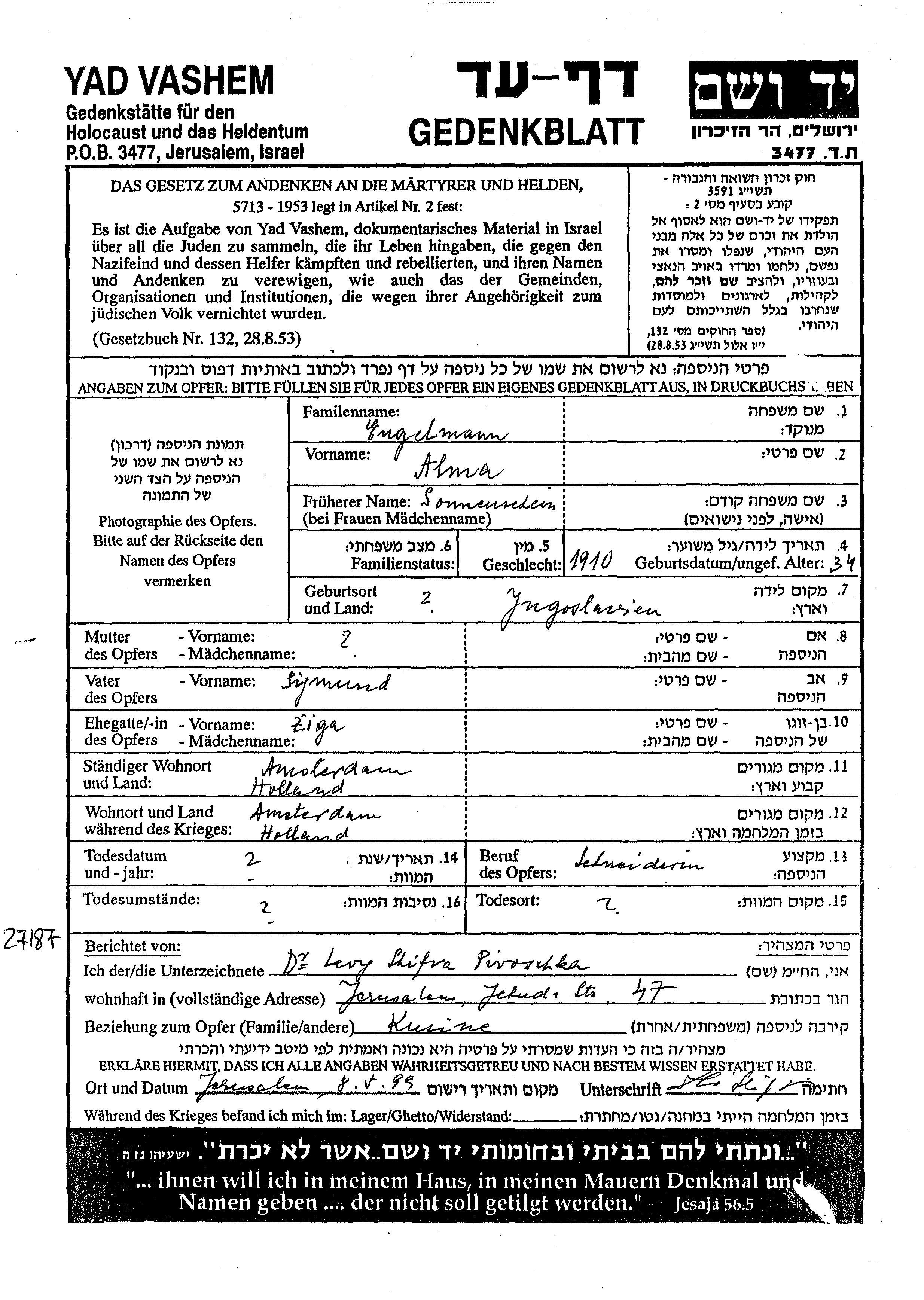 Alma Engelmann nee Sonnenschein was born in Yugoslavia, 1910 to Sygmund. She was a seamstress. Prior to WWII she lived in Amsterdam, The Netherlands. During the war she was in Amsterdam, The Netherlands. Alma was murdered in the Shoah.
