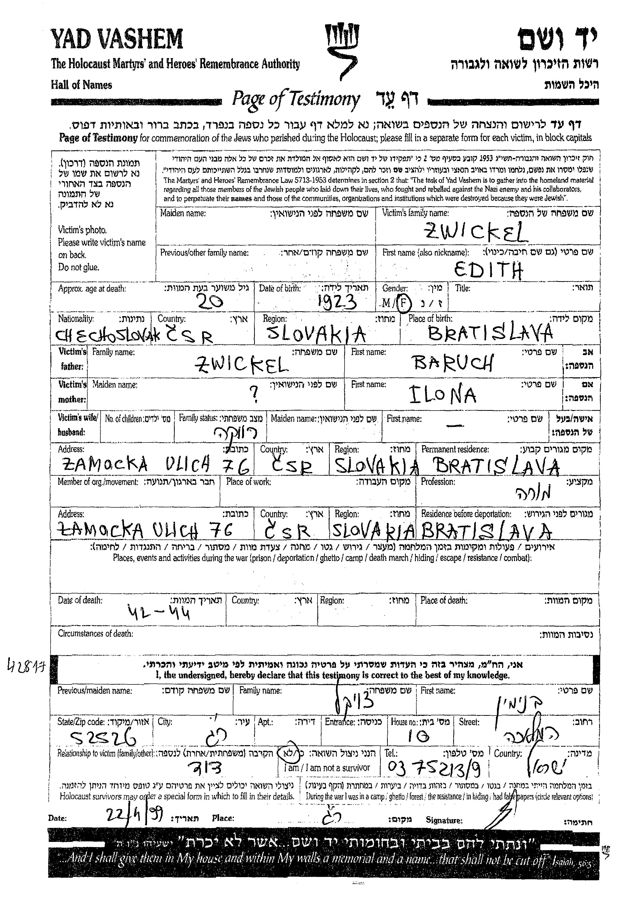 Edit Zwickel Zwickelová was born in Bratislava, Czechoslovakia, 1923. She was a teacher. Prior to WWII she lived in Bratislava, Czechoslovakia.