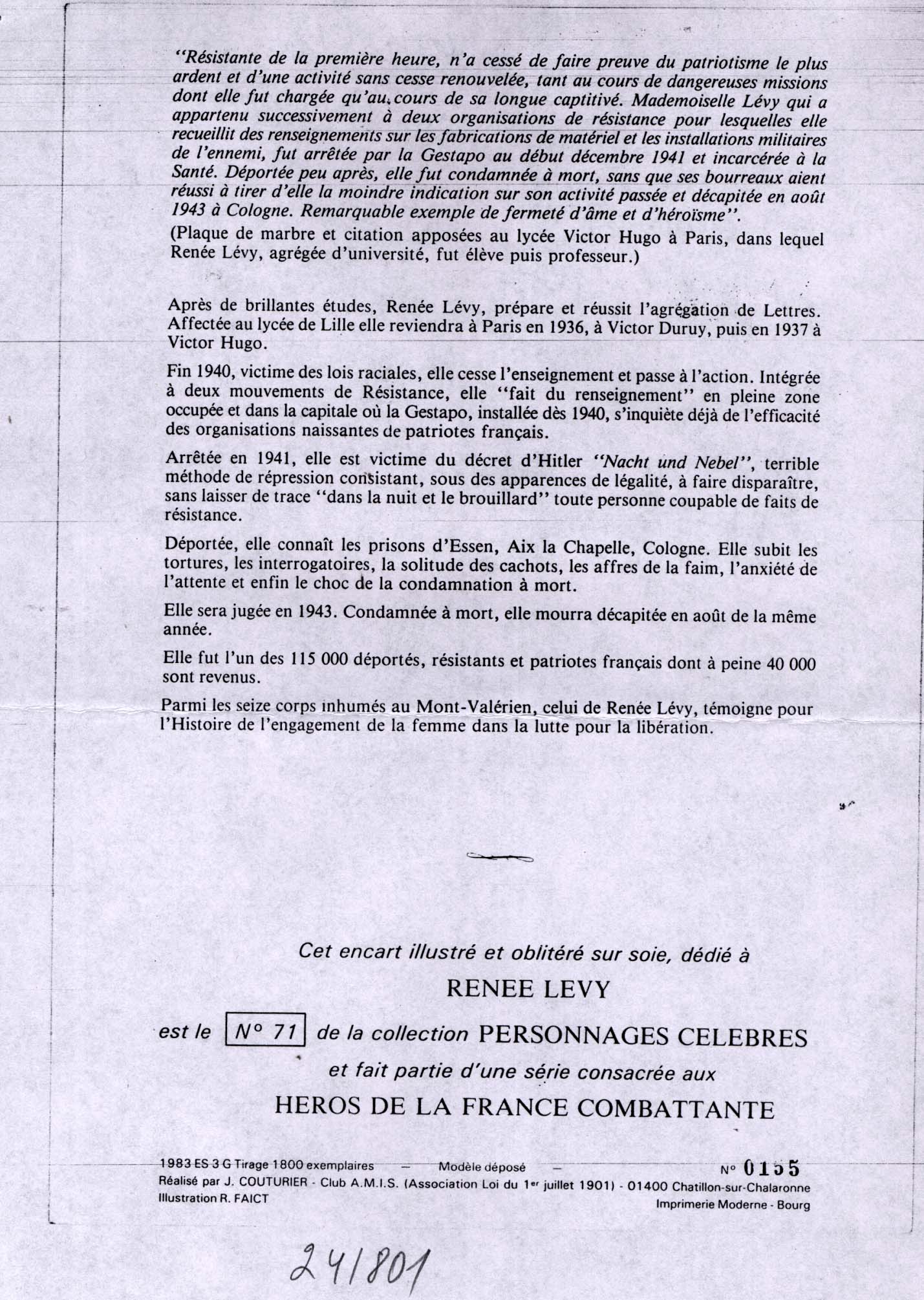Renee Levy was born in Auxerre, France, 1906. She was a professor. Prior to WWII she lived in Paris, France.