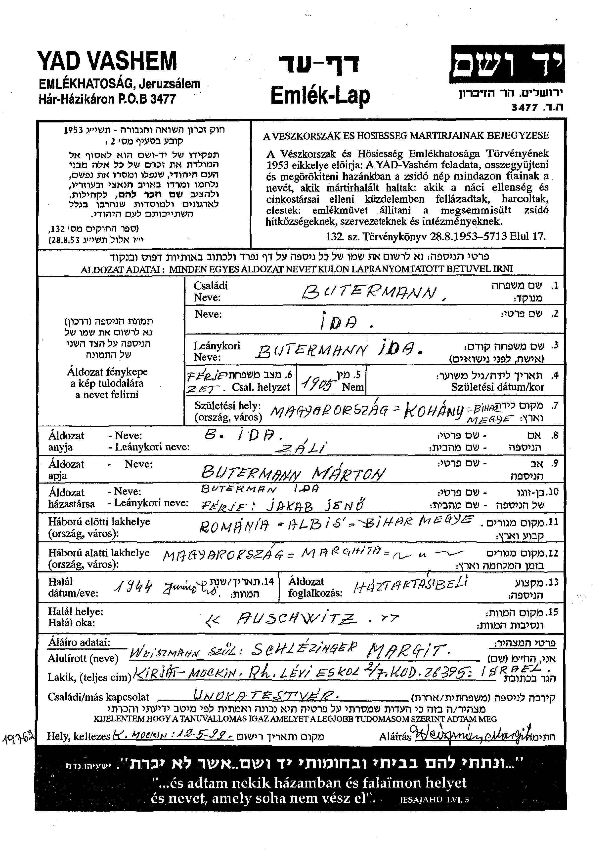 Butermann Ida 1905 Albis, Romania Page of Testimony