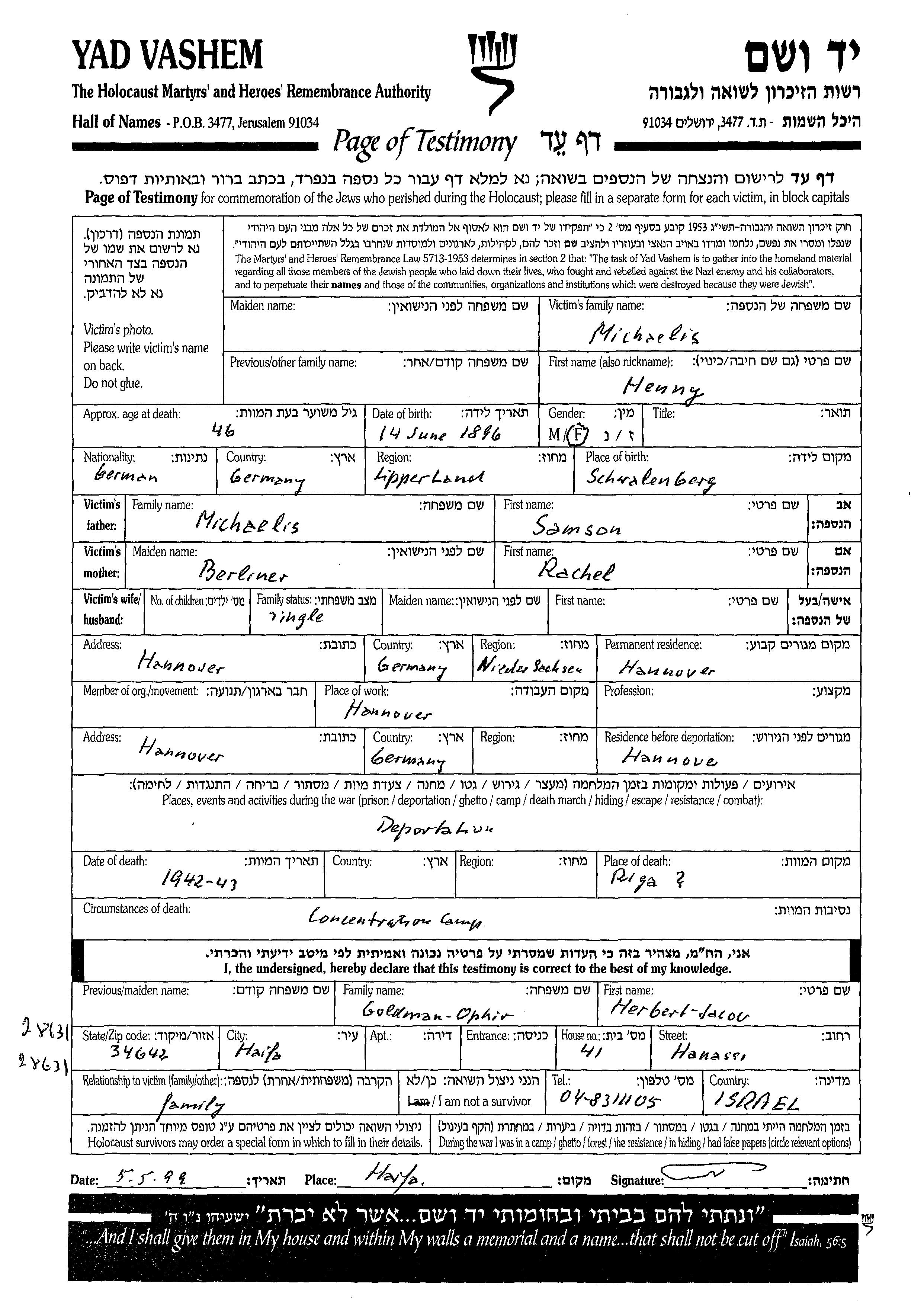 Henny Michaelis was born in Schwalenberg, Germany, 1896 to Samson and Rachel. She was single. Prior to WWII she lived in Hannover, Germany. During the war she was in Hannover, Germany. Henny was murdered in the Shoah. Place of death: Riga, Latvia, 1942.