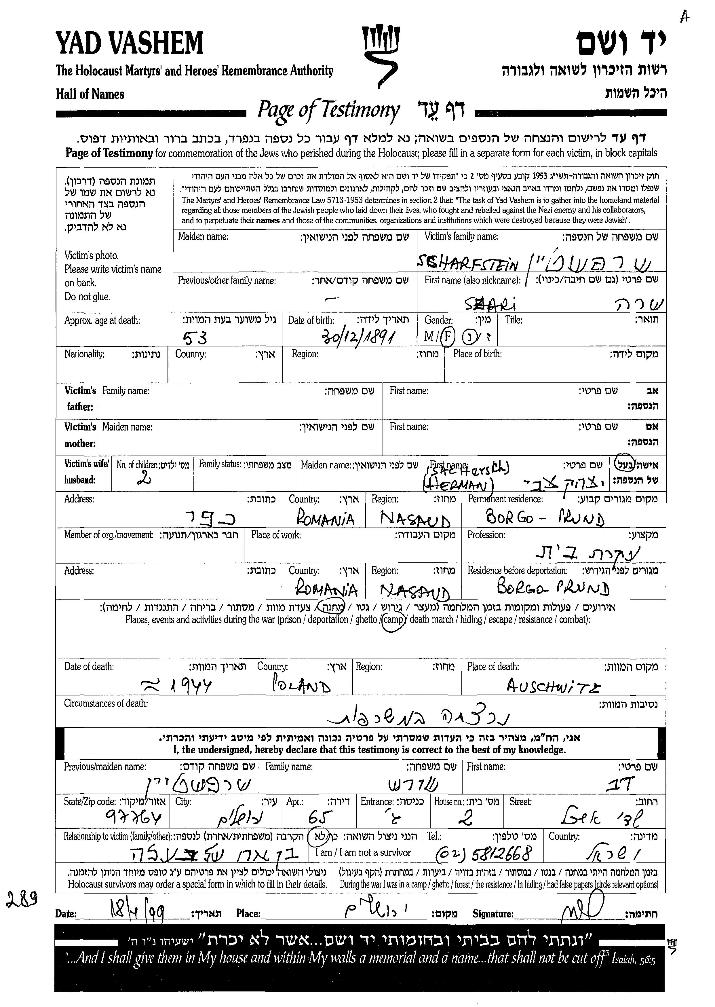 Scharfstein Szari 1891 Borgo, Romania Page of Testimony