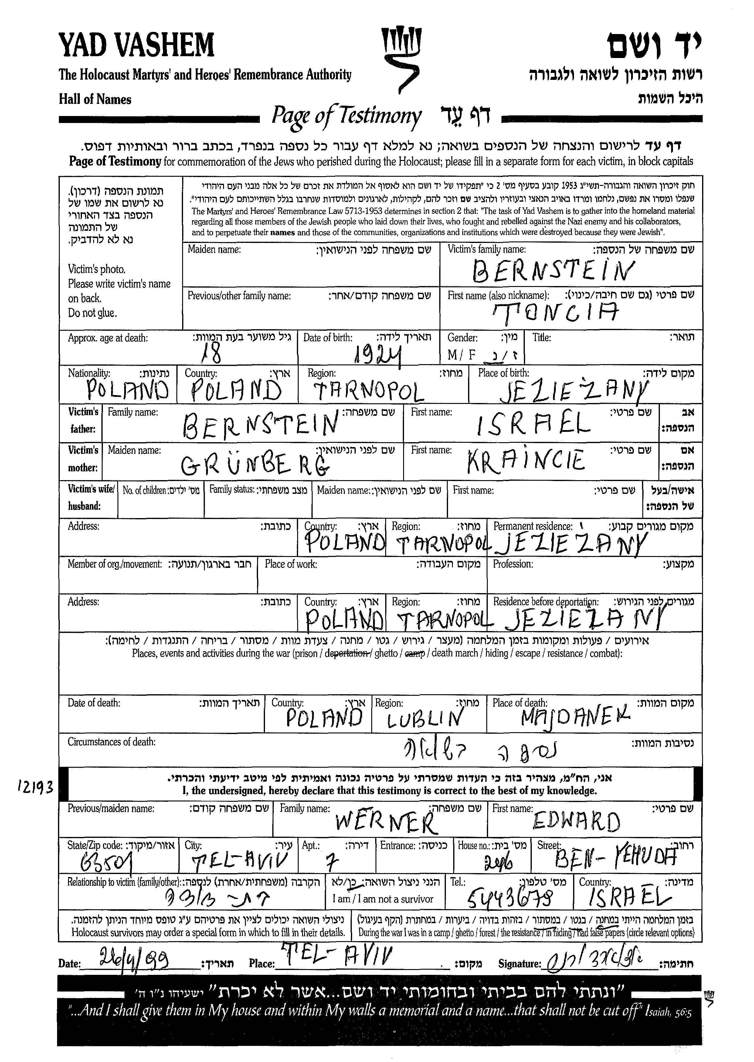 Toncia Bernstein was born in Jeziezany, Poland, 1924 to Israel and Kraincie. Prior to WWII she lived in Jeziezany, Poland. During the war she was in Jeziezany, Poland. Toncia was murdered in the Shoah. Place of death: Majdanek, Poland.