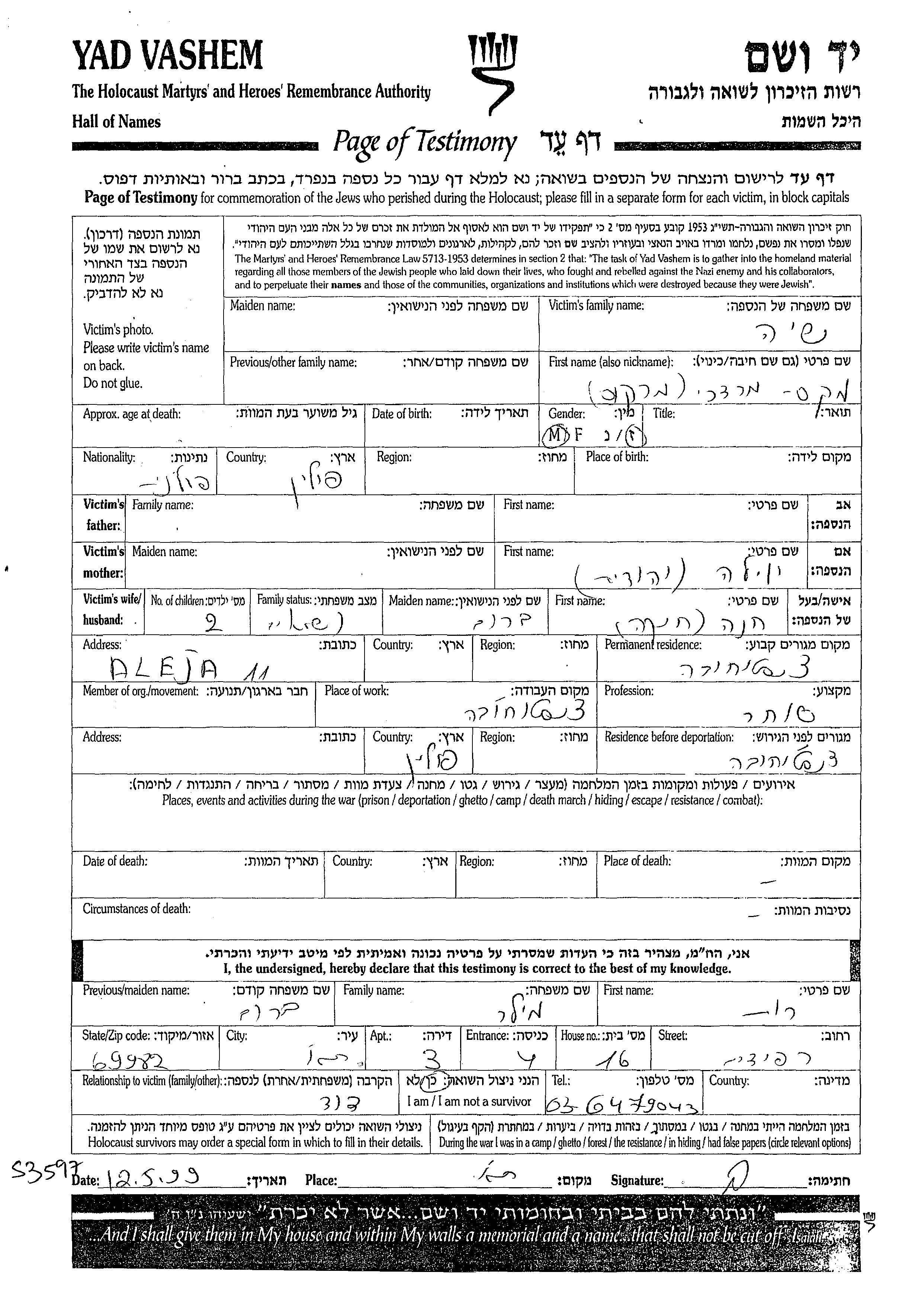 Yad Vashem - Pages of Testimony Names Memorial Collection