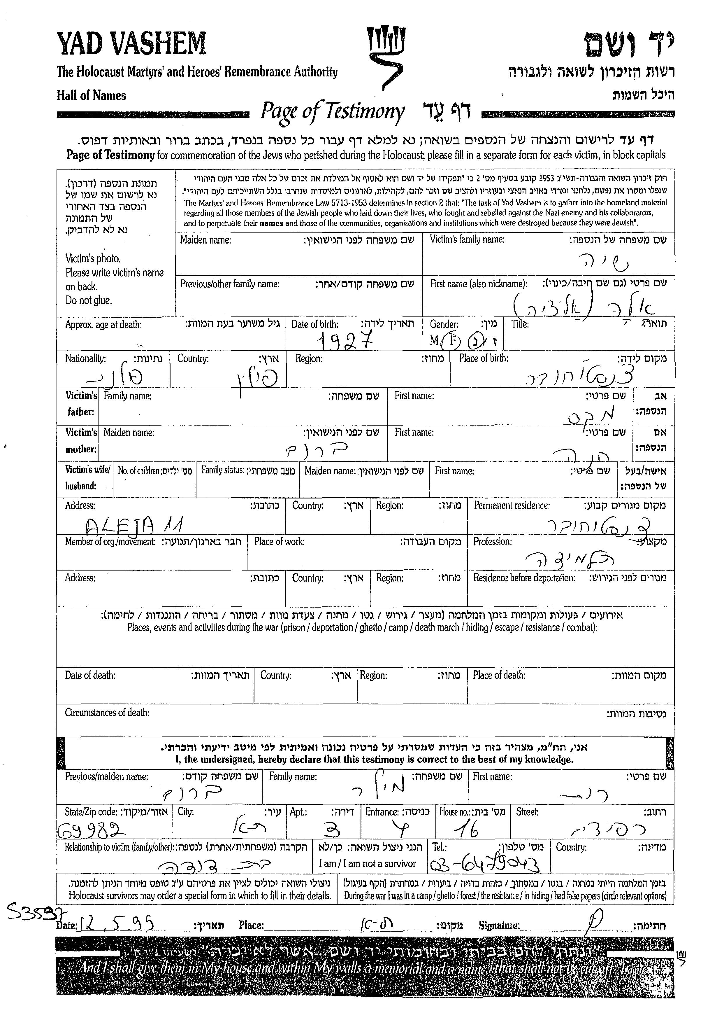 Shia Ela 1927 Czenstochowa, Poland Page of Testimony