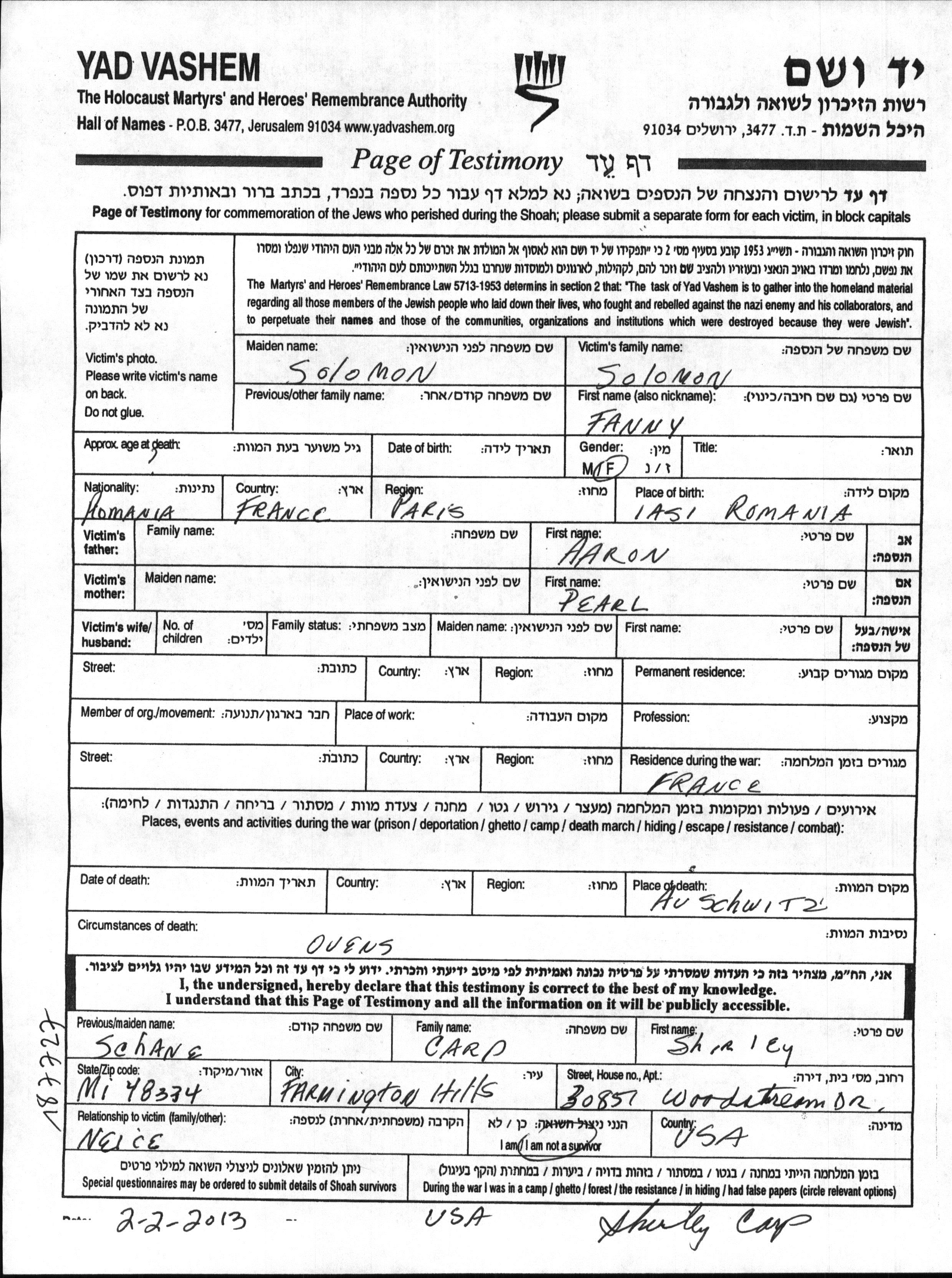 Solomon Fanny unstated place, Page of Testimony